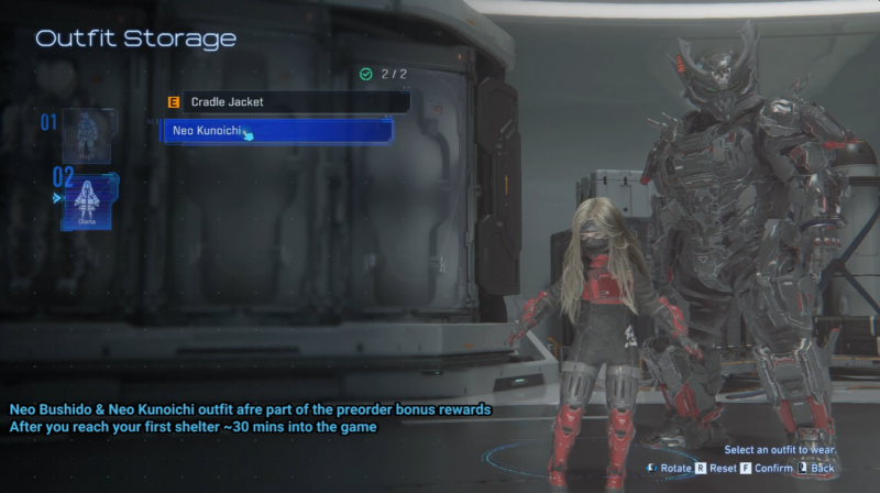 The Neo Bushido outfit for Hugh leans heavily into a futuristic samurai aesthetic, blending traditional armor inspiration with sleek sci-fi materials. Meanwhile, the Neo Kunoichi outfit for Diana reflects a stealth-focused design, combining agility with a high-tech ninja style.