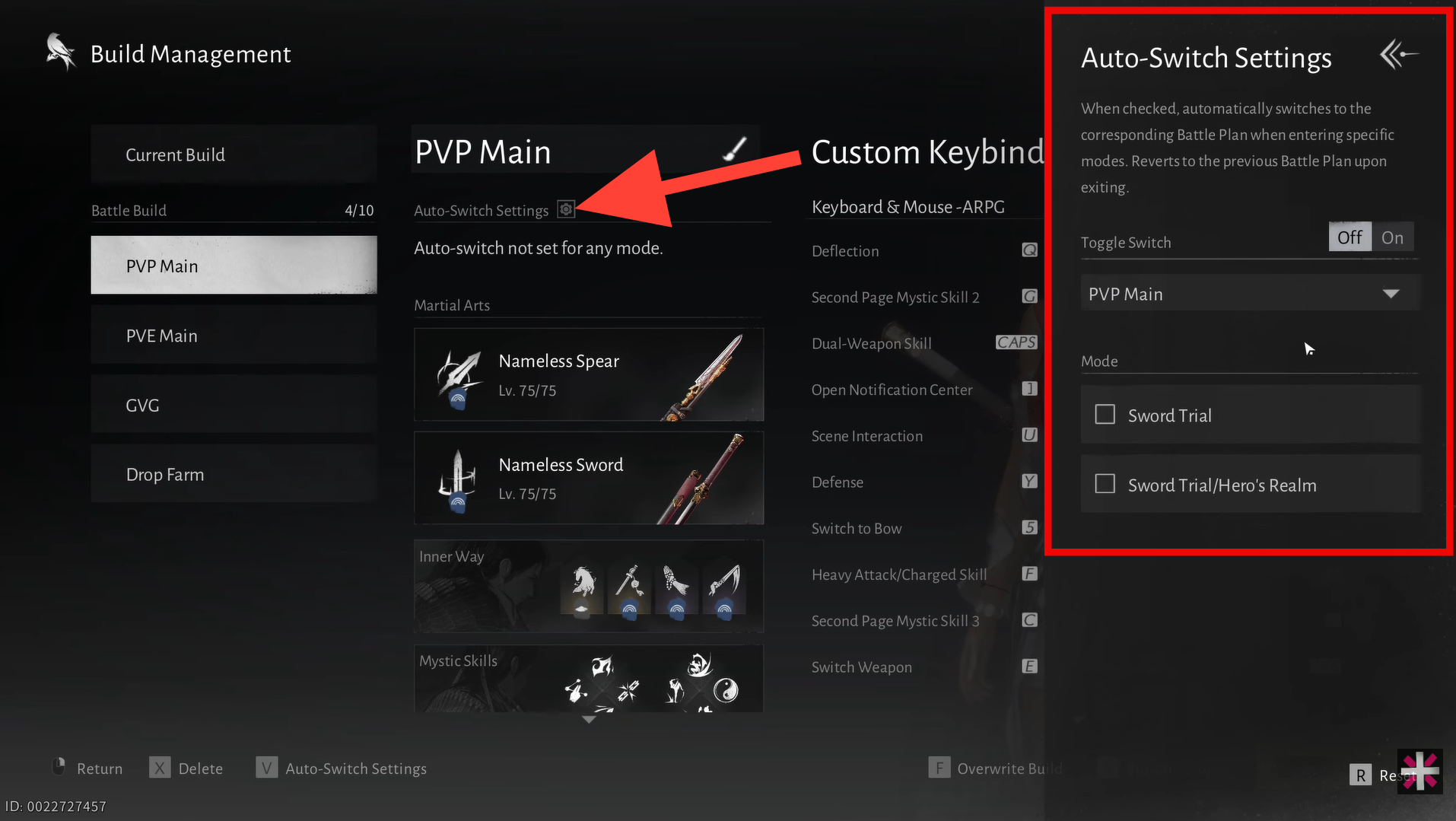 Link the gear set to specific content in the auto-switch settings, PvE (Sword Trials, dungeons, etc.) or PvP (Arena, Wandering Pass, GVG). When you enter that content, the game automatically equips the correct gear, tuning, and keybinds, so you don’t have to switch manually.