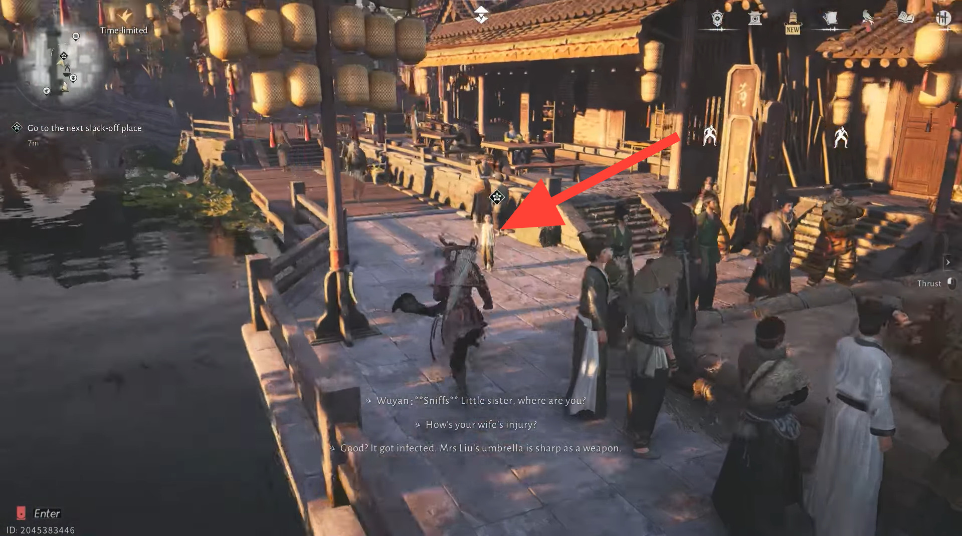 Follow the quest marker to the Nine Mortal Ways Umbrella Headquarters, where you’ll find Zhen Yu standing in front of a queue.