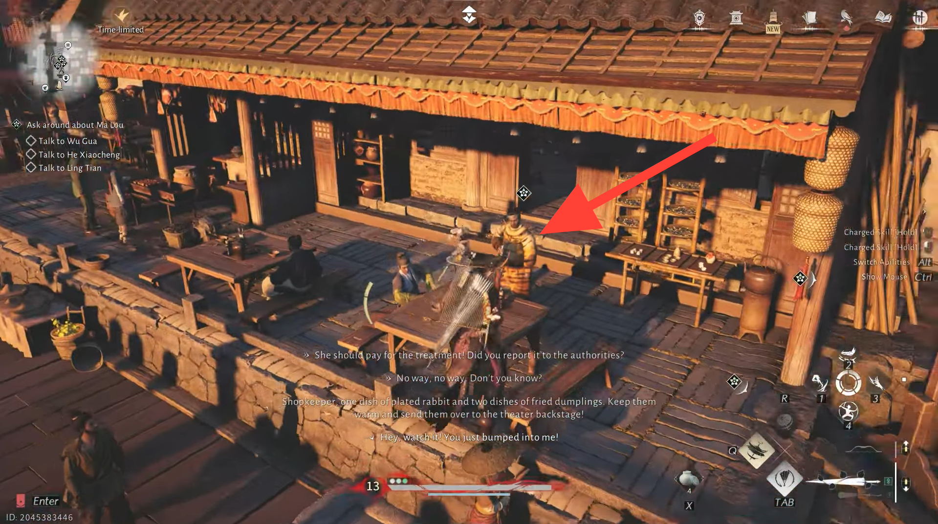 After reaching the next quest area, speak with Jia Gongze to find out what’s going on. Afterwards, use Celestial Seize to steal the Young Justice Bun by Detective Tee item from him.