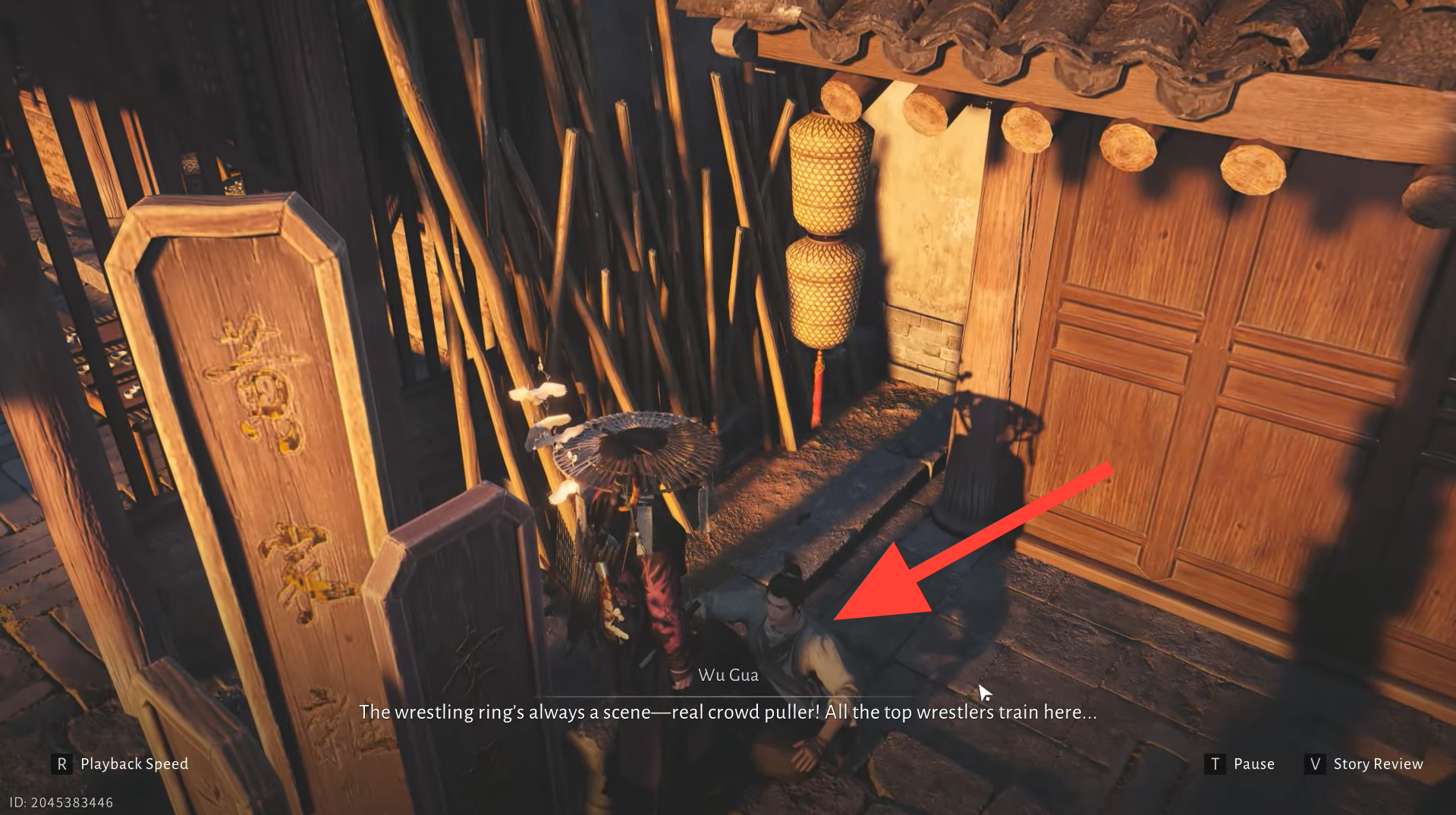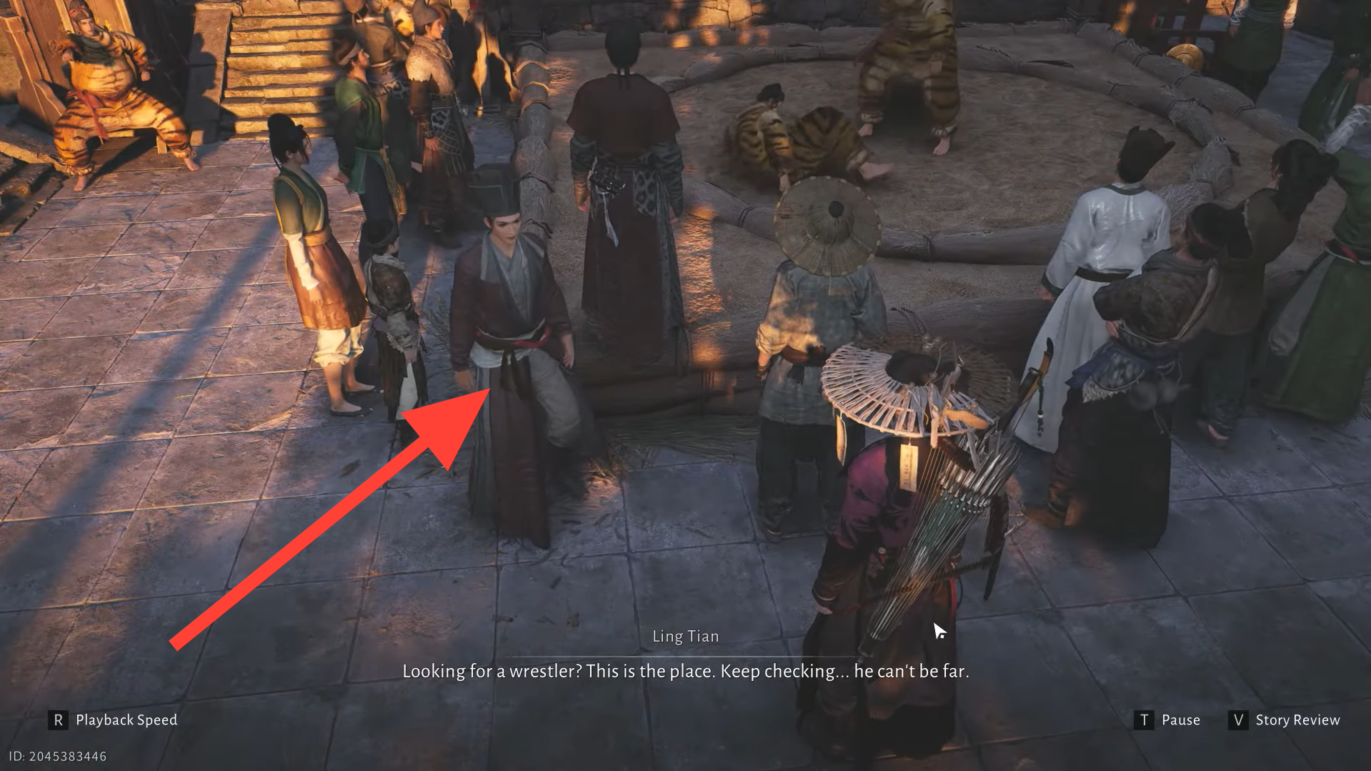 Follow the quest marker to the next quest area and speak with Ge Mang beside the wrestling ring to continue.