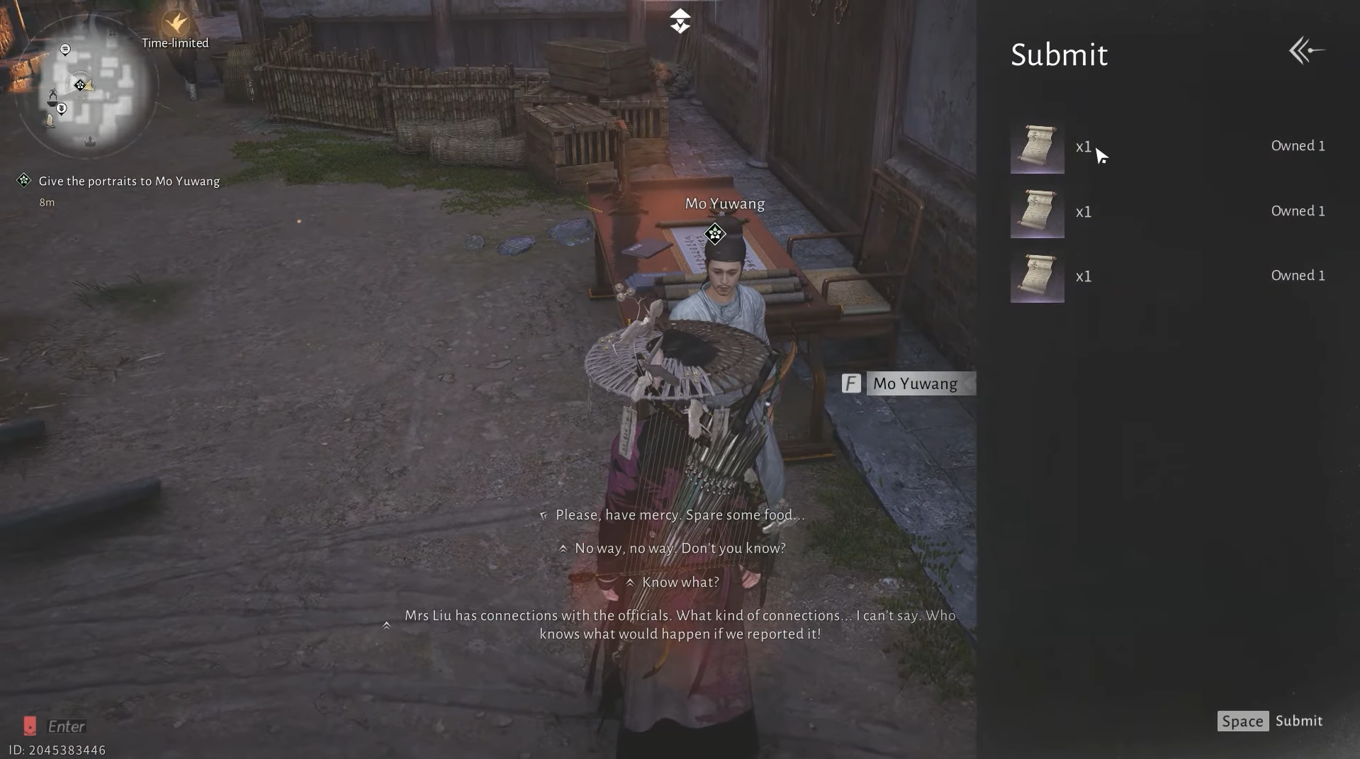 Speak with Mo Yuwang and give him the three portraits to complete the quest and receive your rewards.