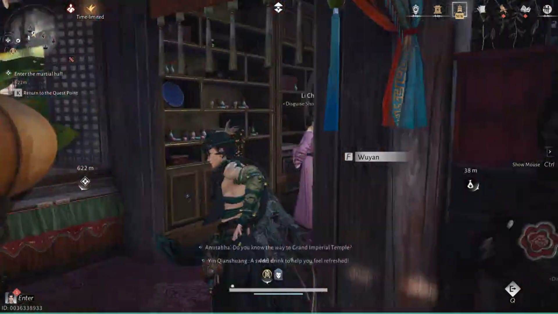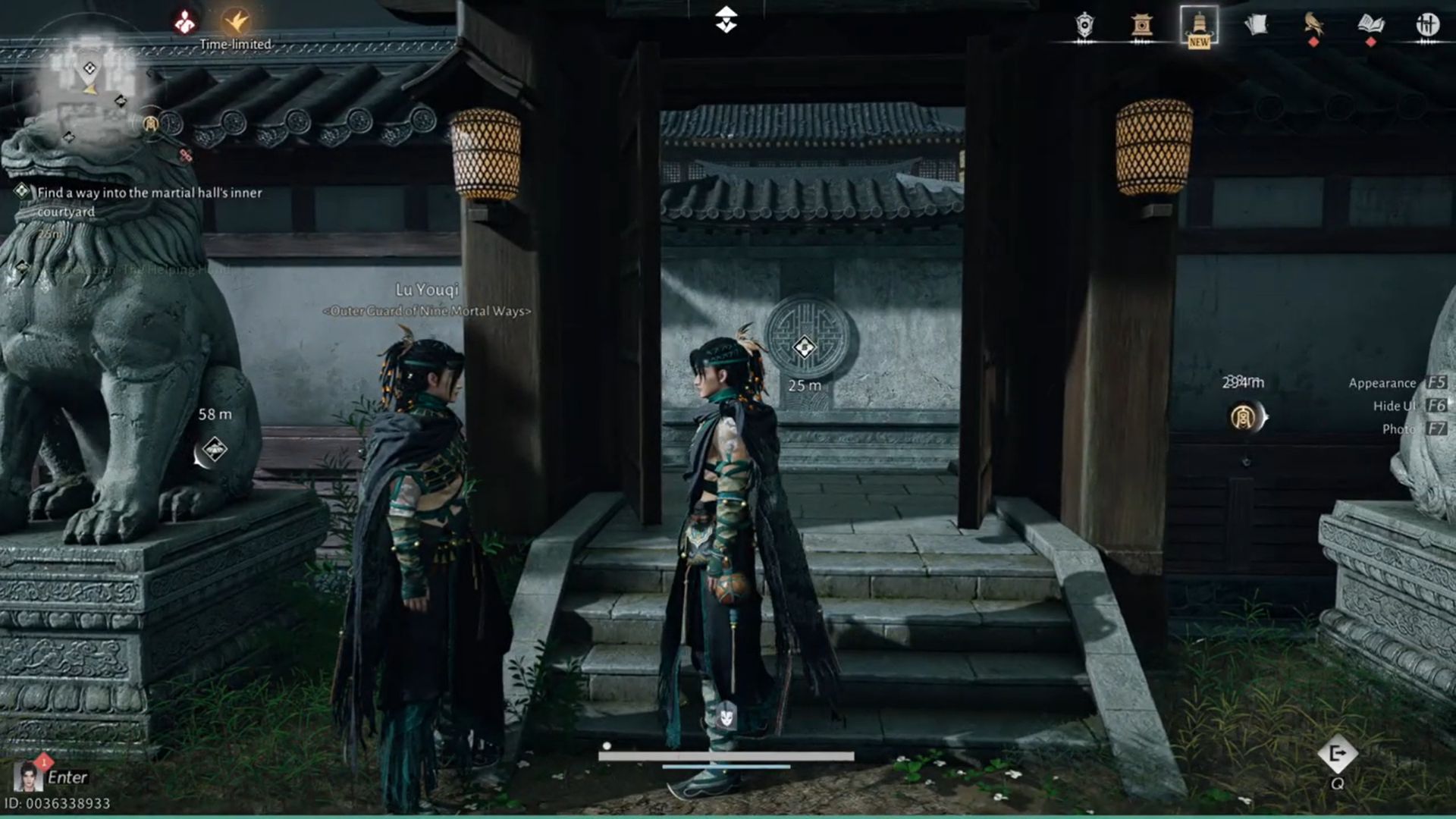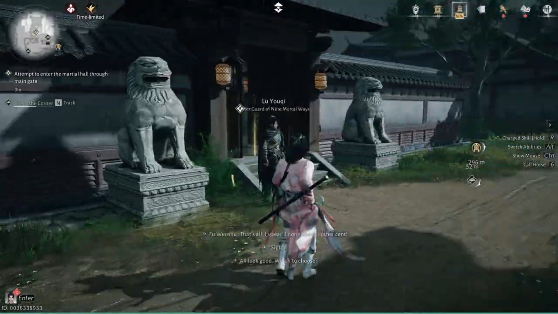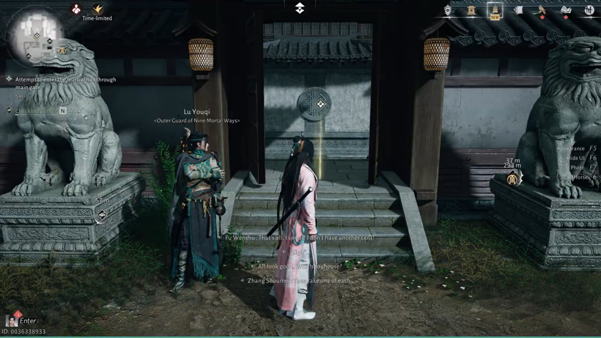 As you try to enter the Martial Hall, you will be stopped by Lu Youqi who is the guard of the Nine Mortal Ways. Talk to him to attempt entry.