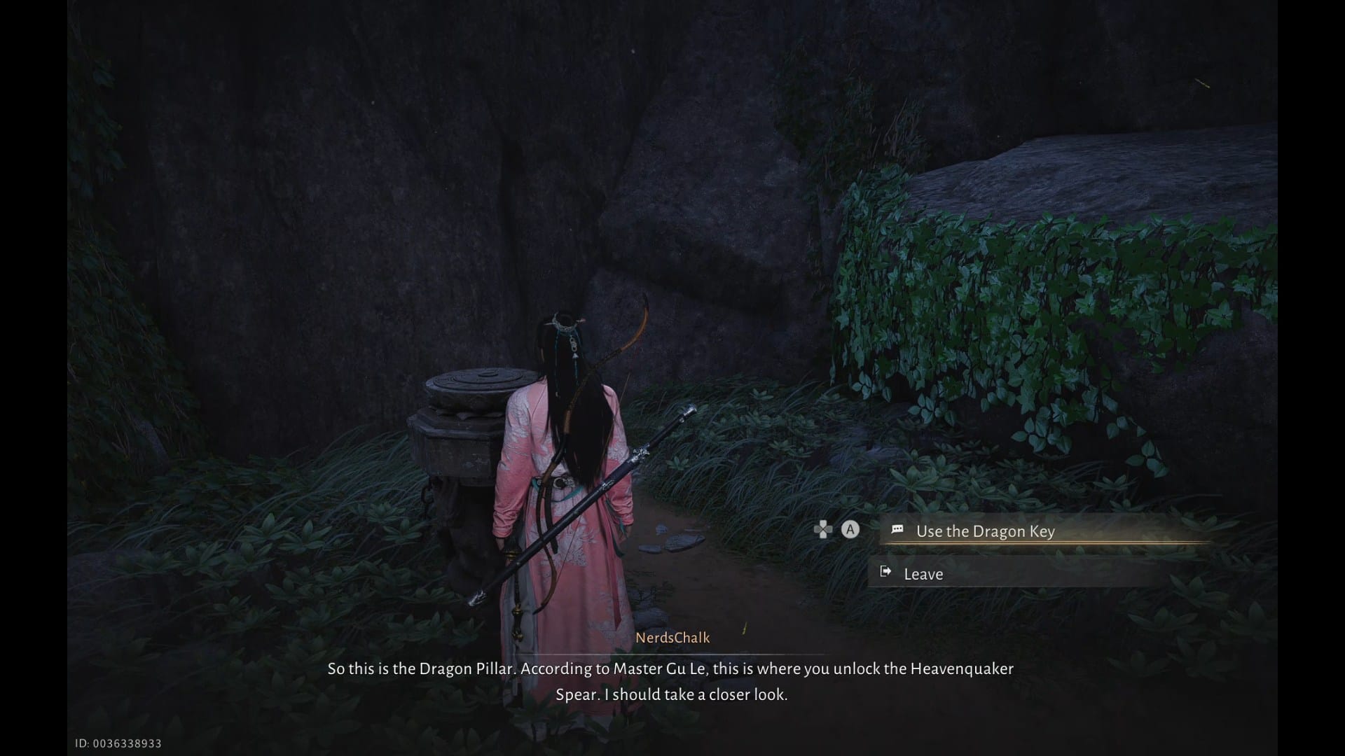 Interact with the entrance pillar, consume the Dragon Key, and proceed into the cave system revealed.