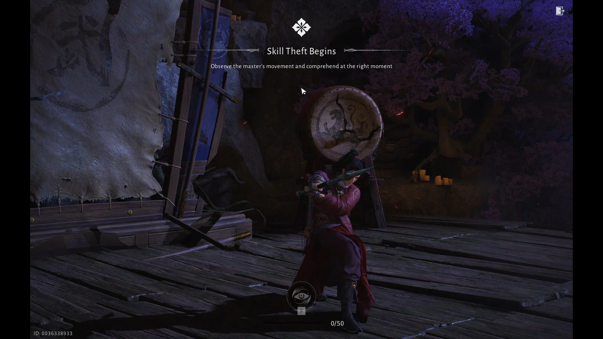 Carefully navigate through the guards, then stand on the glowing blue circle to initiate the skill theft interaction with the Master.