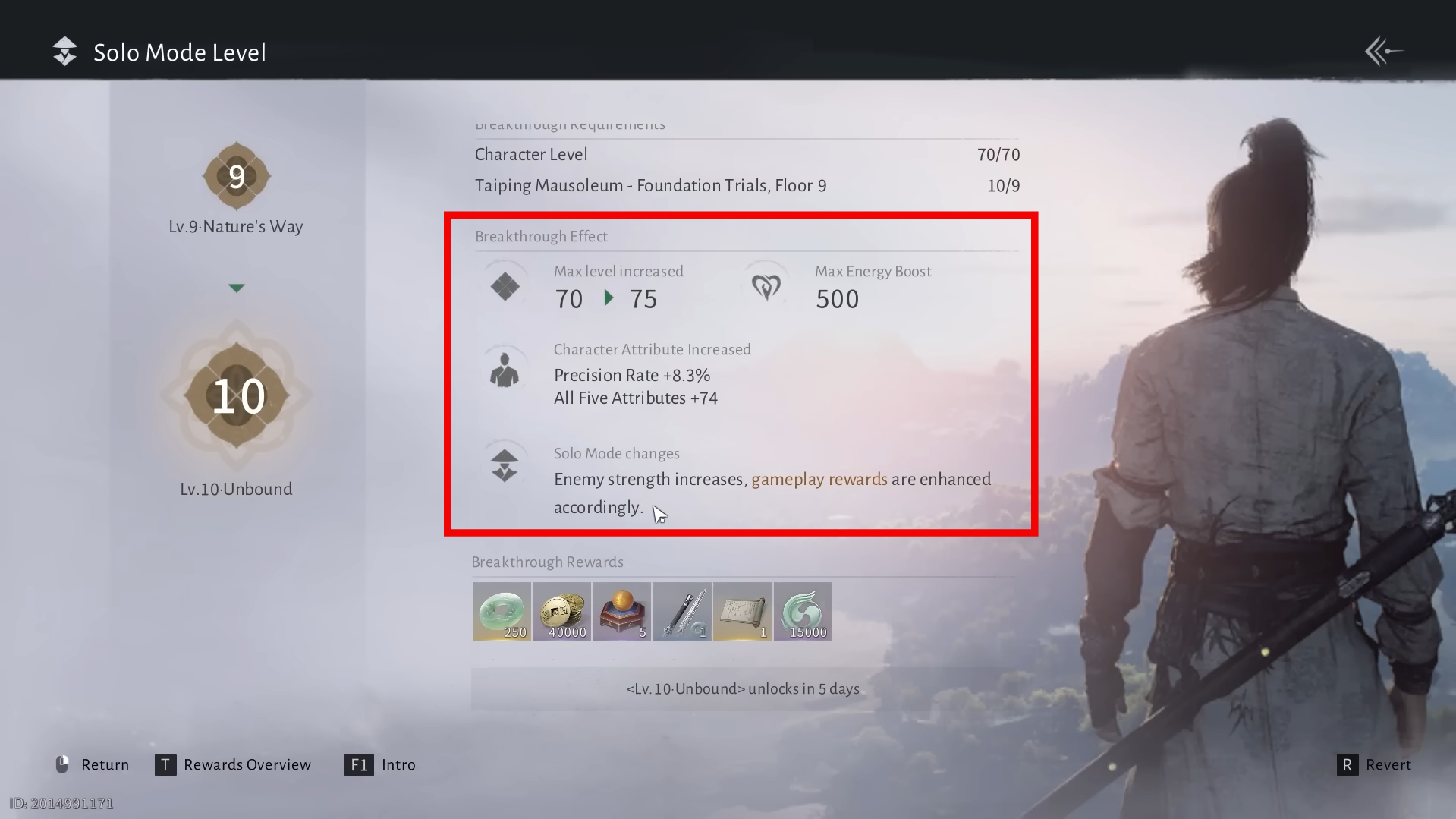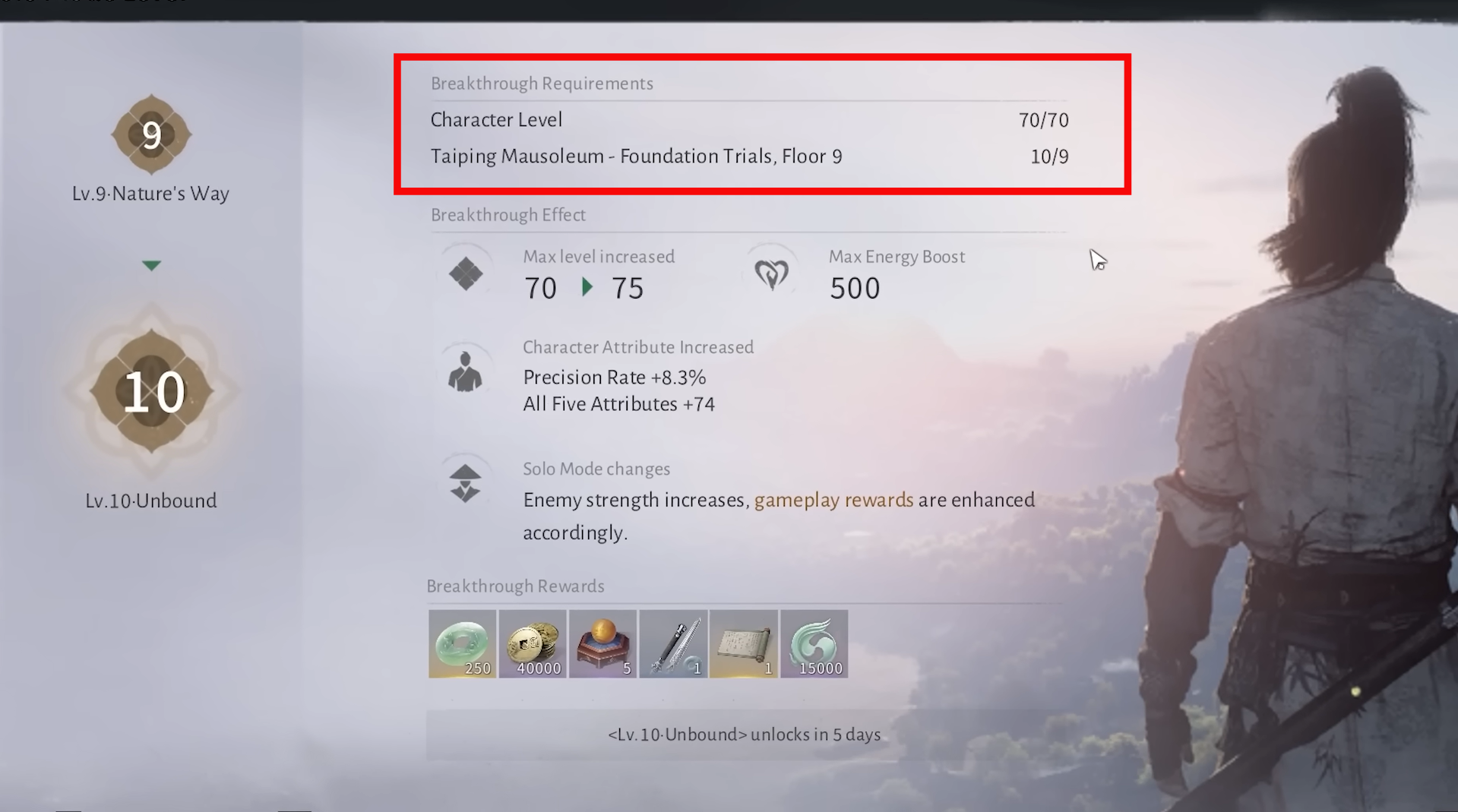 - Breakthrough 10 is called Unbound and raises the Solo Mode cap from 70 to 75.