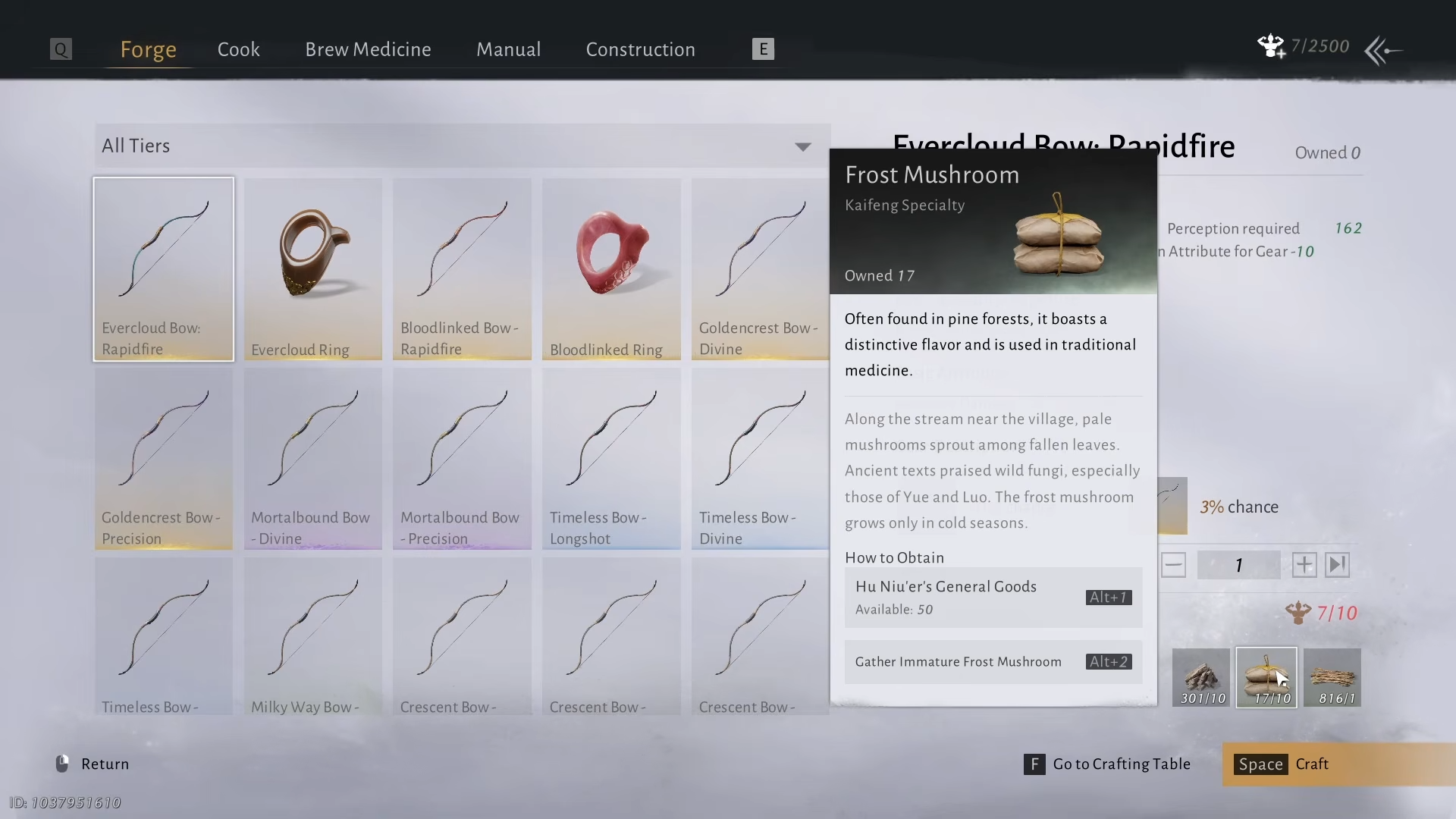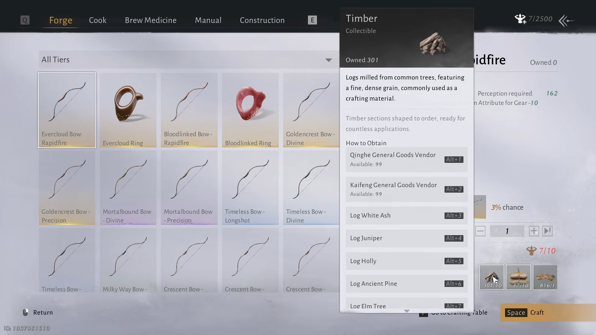 Timber shows up as a consistent ingredient across bow tiers, so chopping trees now is efficient preparation.