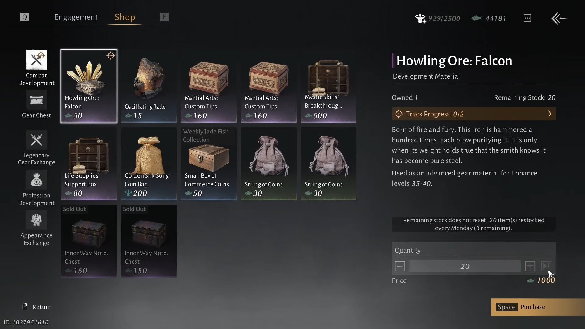 | Enhancing resource | Keep buying Howling Ore Falcon weekly | Still needed for the next milestone of enhancing |