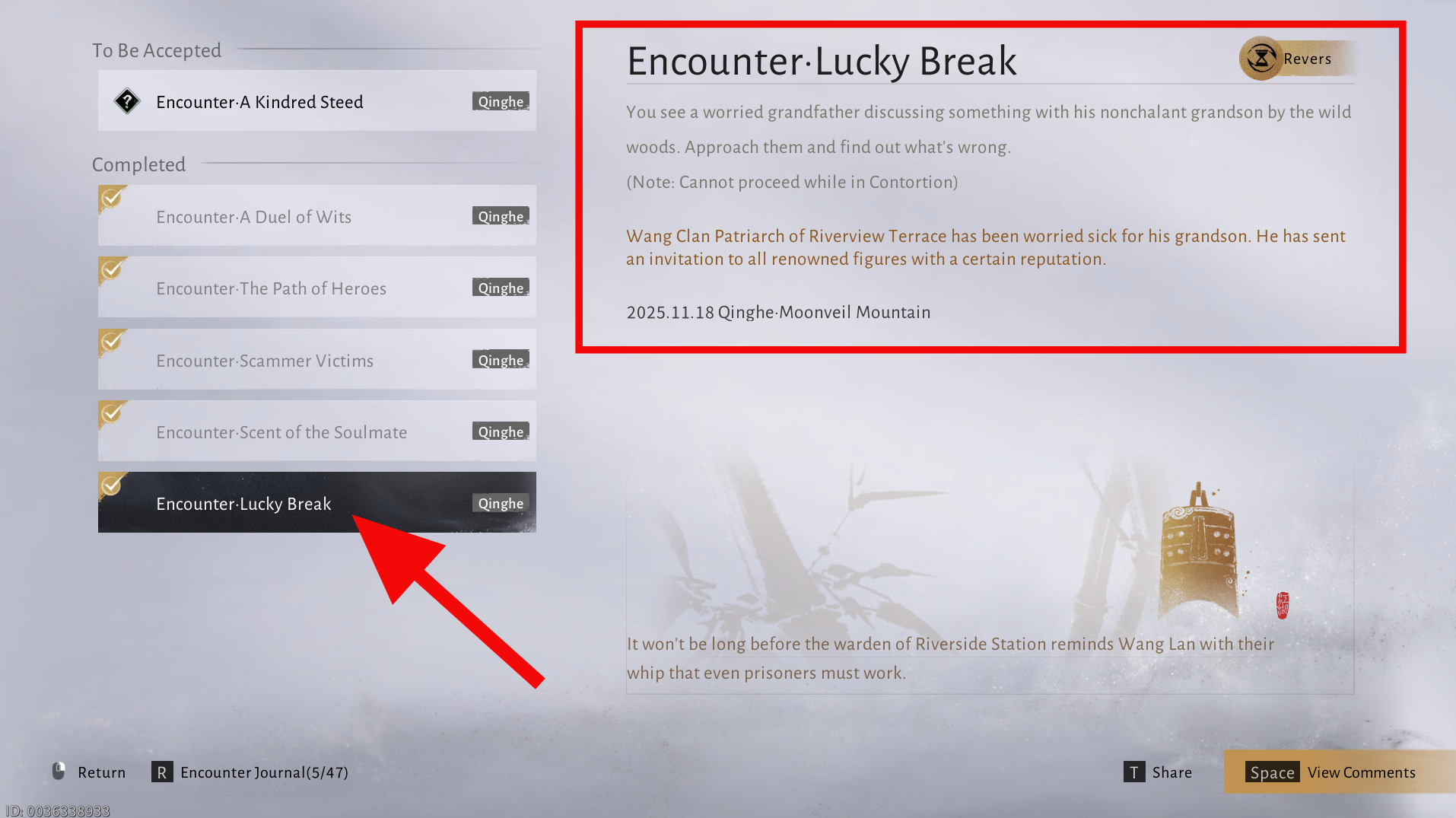The Lucky Break encounter quest in Where Winds Meet begins when you meet the Wang Clan Patriarch at a marked location. You progress by interacting with key characters like Du the Broker and Wang Lan, visiting the Lumber Camp and Riverside Station, all while following the quest’s narrative. This quest features exploration, dialogue, and key interactions.