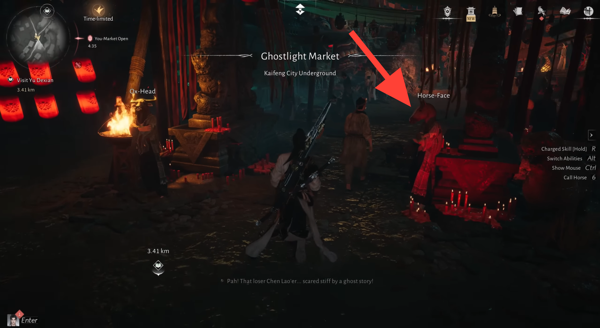 Equip the Ghost Rat Mask to interact with vendors in the Ghostlight Market. If you don’t already have one, speak to Horse Face at the market entrance to obtain it.