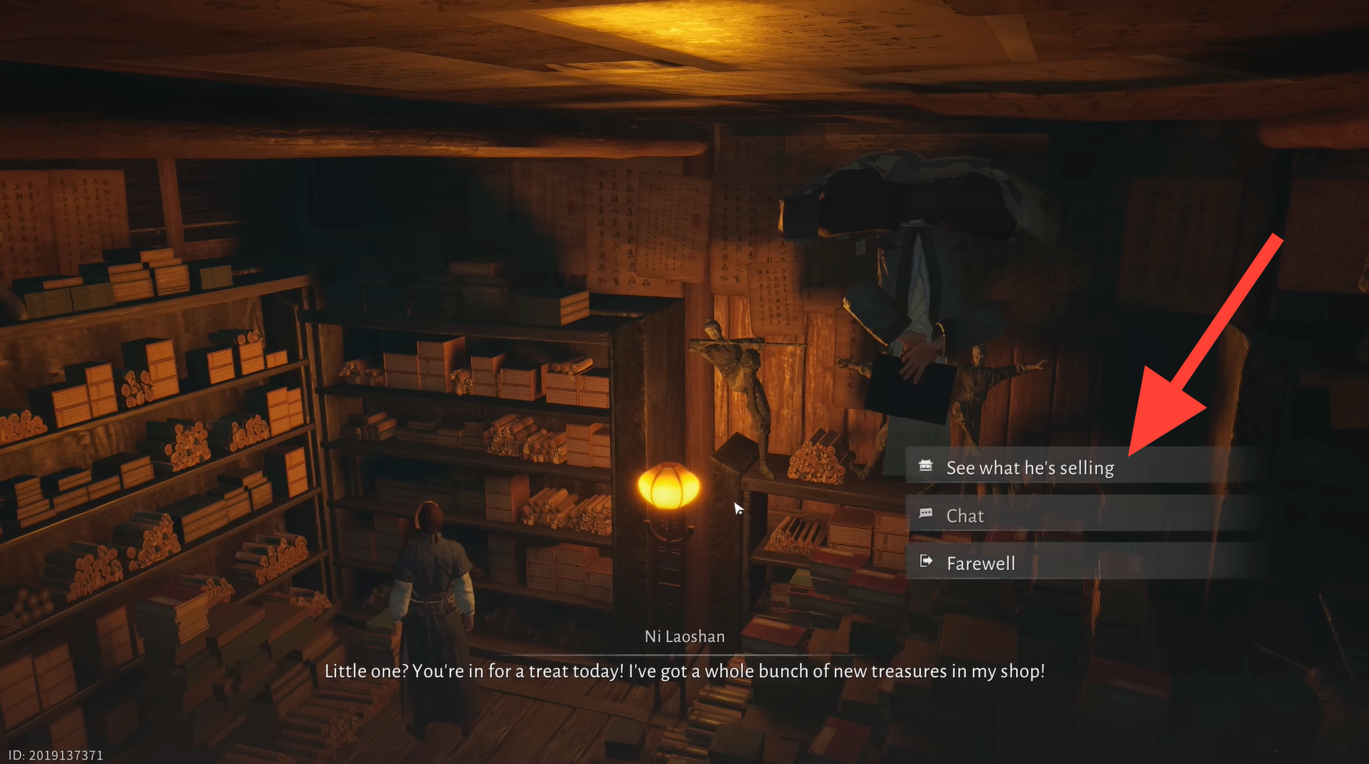 Enter the shop and speak with Ni Laoshan, who is seated on the ceiling. Select “See what he’s selling” to open the shop menu.
