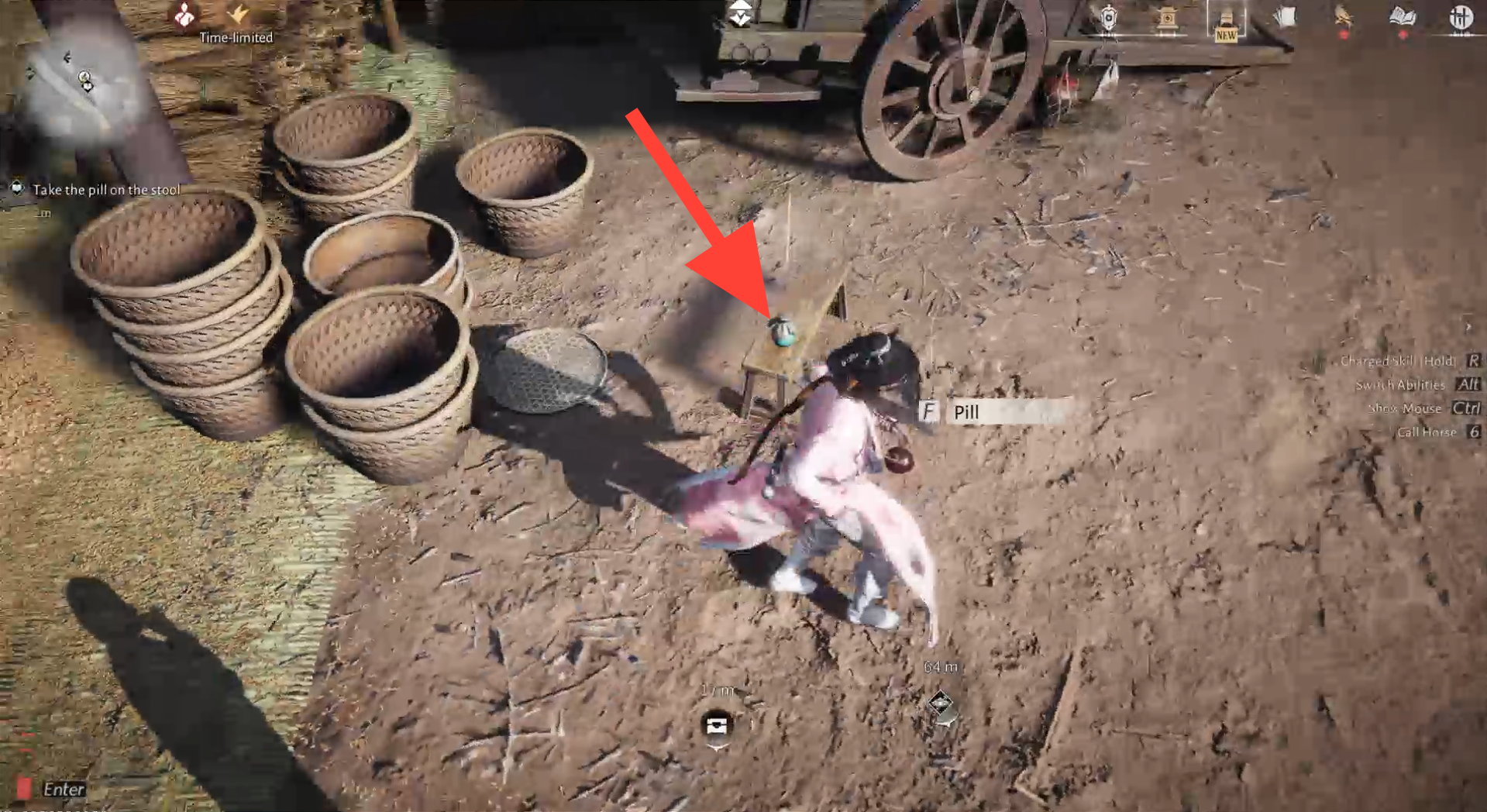 After handing over the rat, Bai Ji will reward you with a pill. Pick it up from the wooden stool right in front of him.