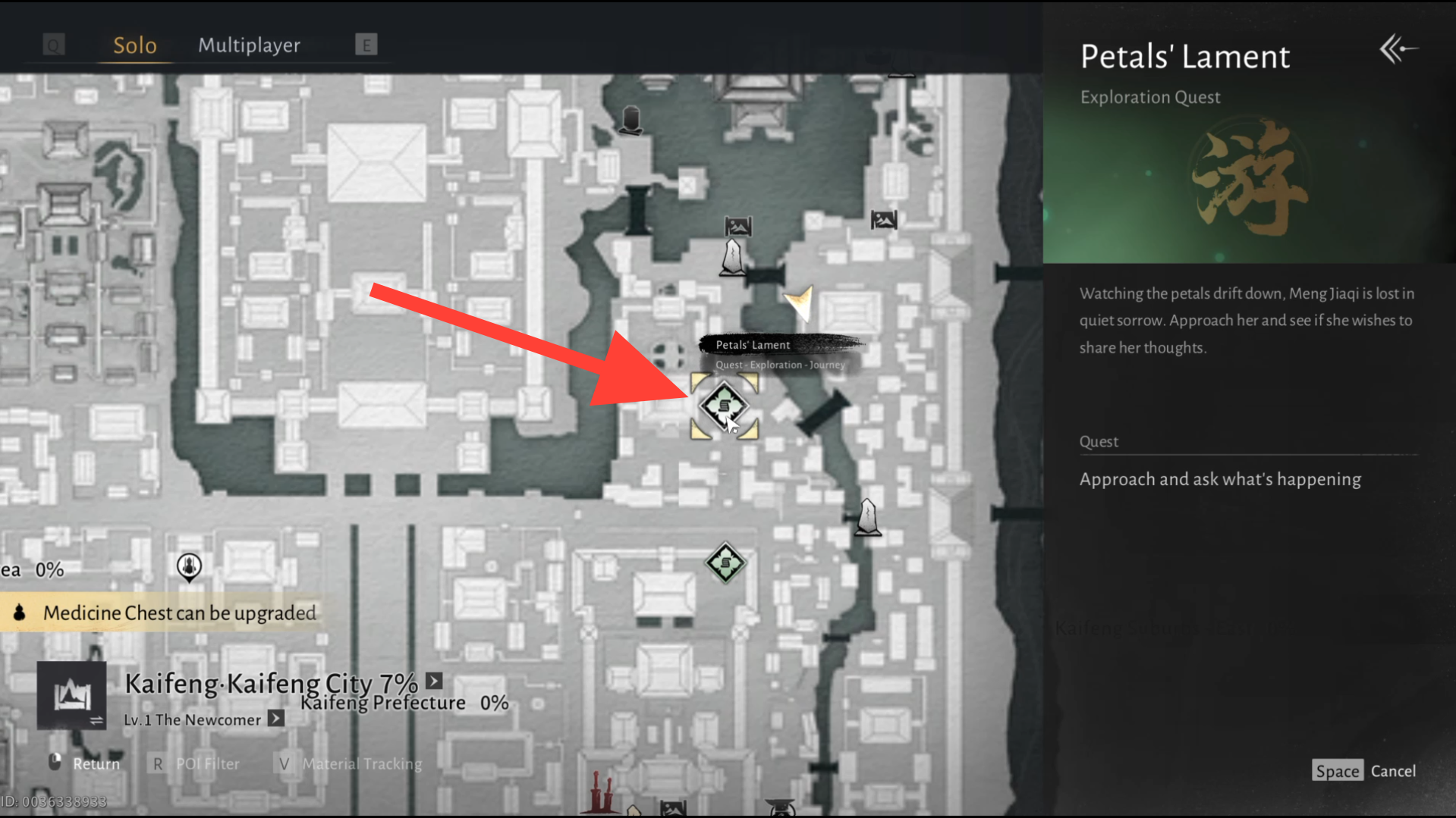 Petal's Lament is a brief Exploration Quest in Where Winds Meet that begins with Meng Jiaqi at the Temporal Pavilion in Kaifeng City. You'll follow clues through the city and the Bamboo Forest, interacting with key characters to solve a riddle before returning to complete the quest.