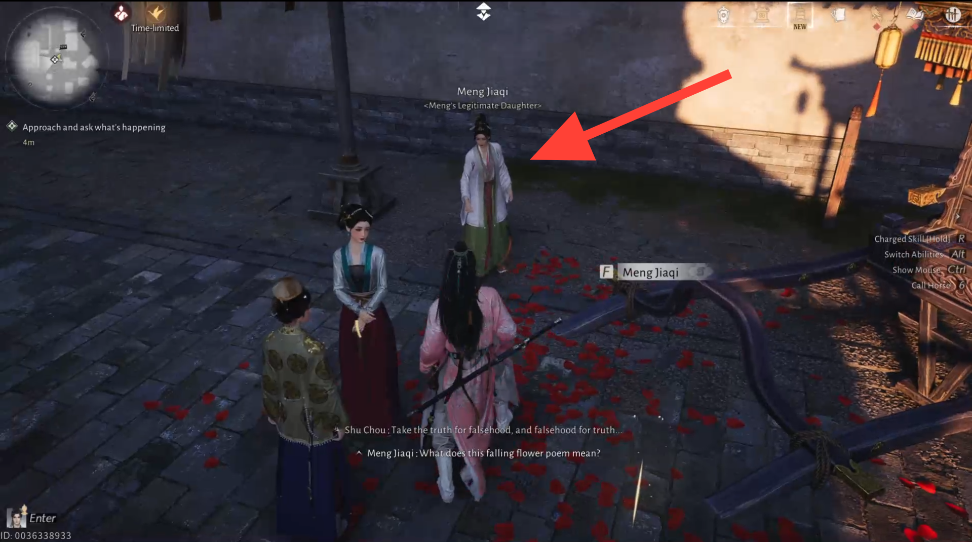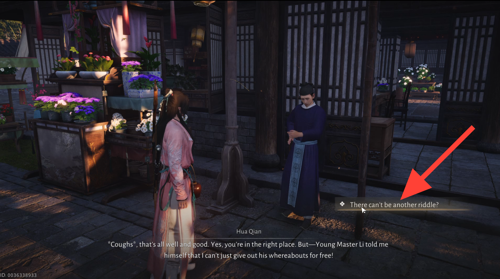After inspecting the red petals, continue straight ahead, take a left, and speak with Hua Qian, who is standing outside a flower shop.