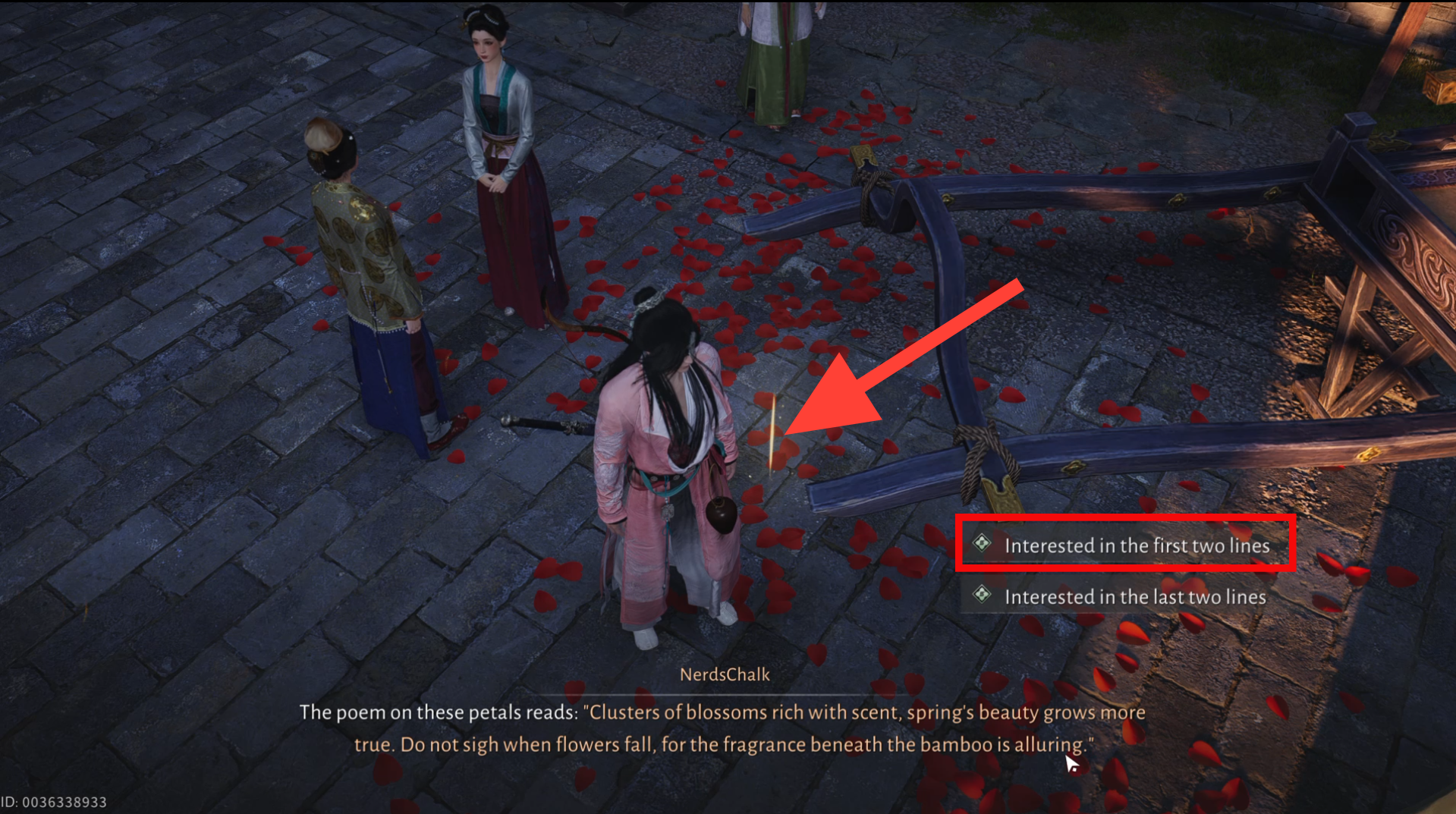 Examine the red petals on the floor near Meng Jiaqi and select the "Interested in the first two lines" option.
