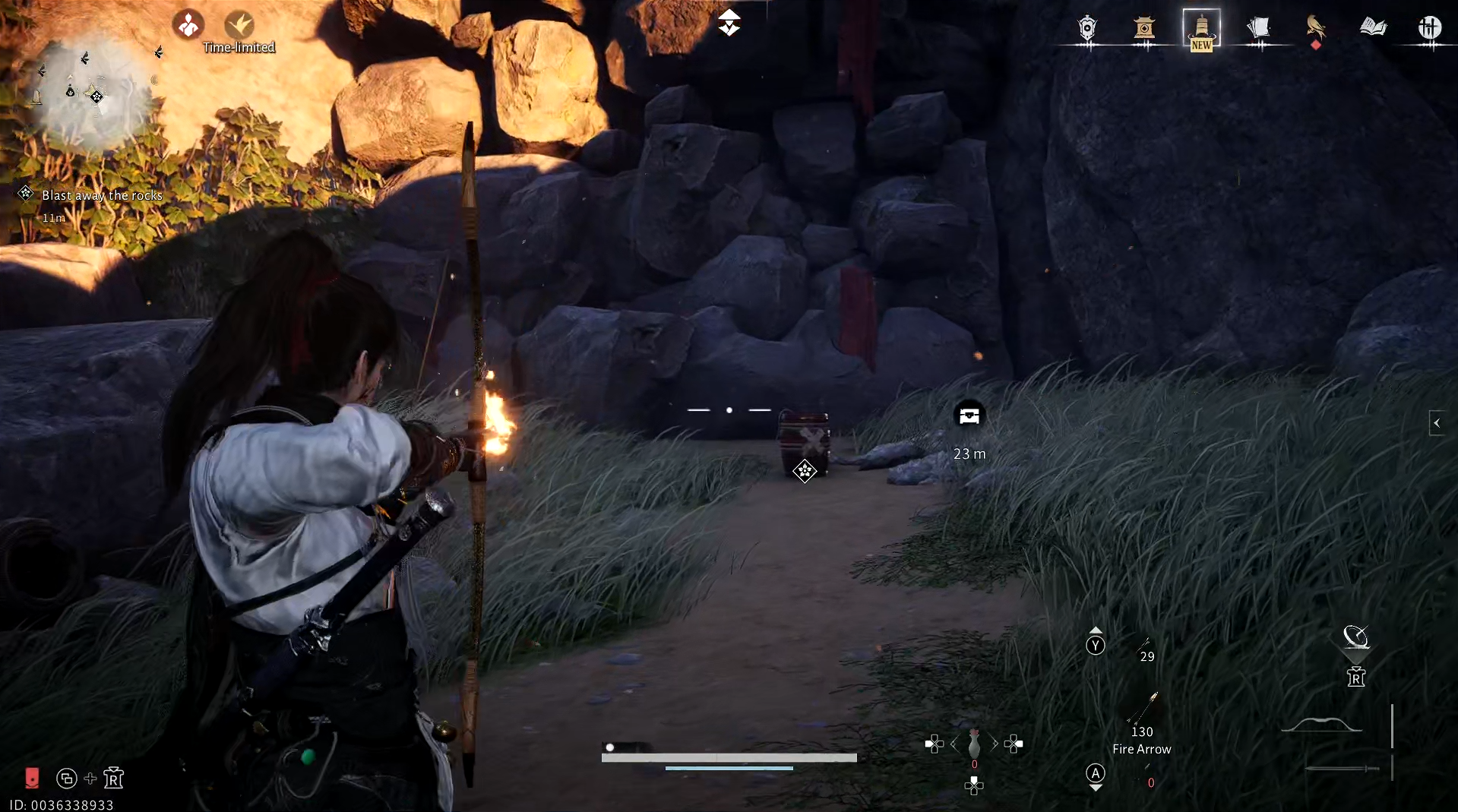 Grab one of the fire barrels located to the right of the boulders, place it in front of the rocks, then shoot it with an arrow to detonate it and clear the blockage.