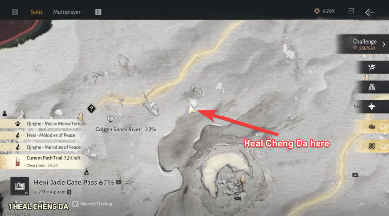 Approach Cheng Da and activate Wind Sense, the game’s special interaction ability used to assist NPCs or investigate objects. Using Wind Sense will heal Cheng Da and initiate the wandering tale event.