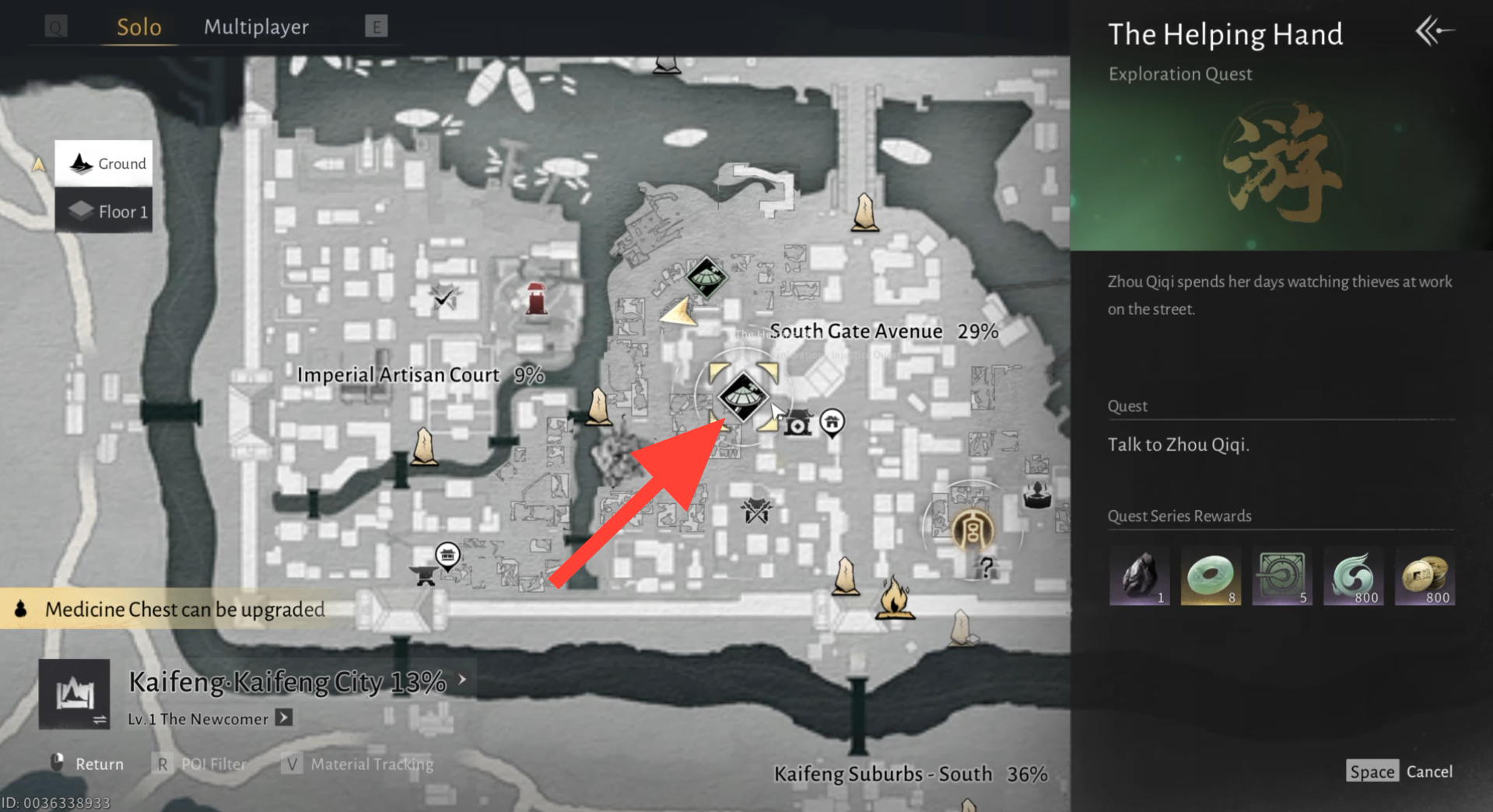 To start this exploration quest, speak with Zhou Qiqi, a child standing along the street in South Gate Avenue, Kaifeng City.