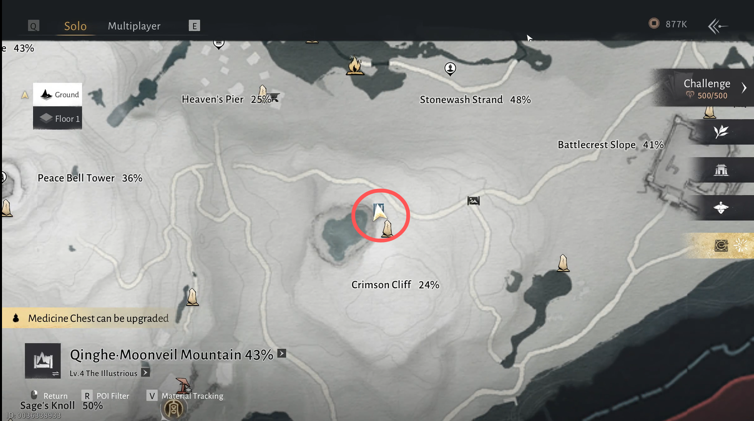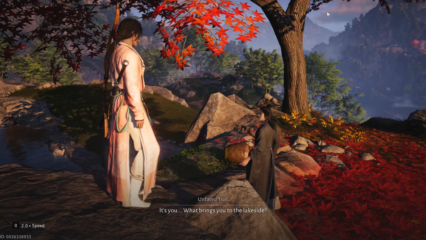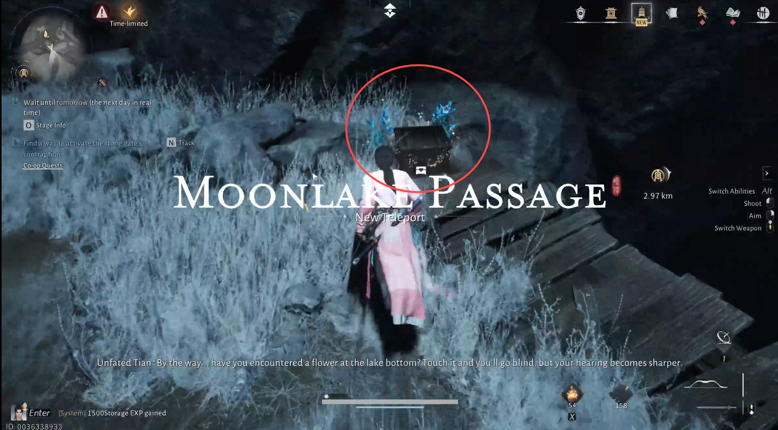 Travel to Moonveil Mountain in Qinghe, near the lake at Crimson Cliff and speak with Unfated Tian, who explains the shrine hidden under the lake.
