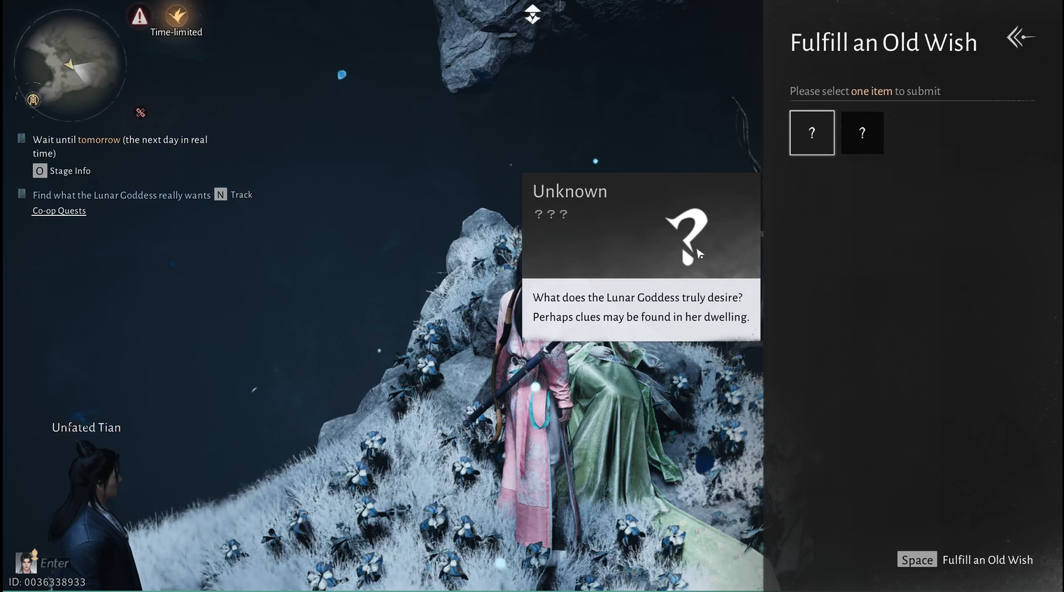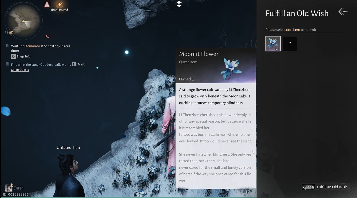 Return to the Lunar Goddess and offer either the Moonlit Flower or the Small Blade.