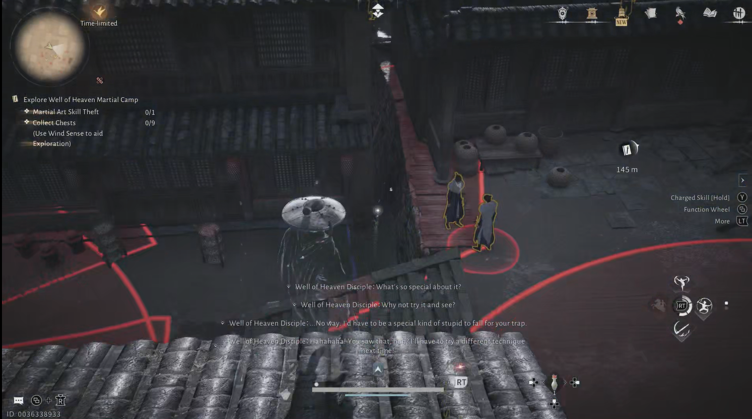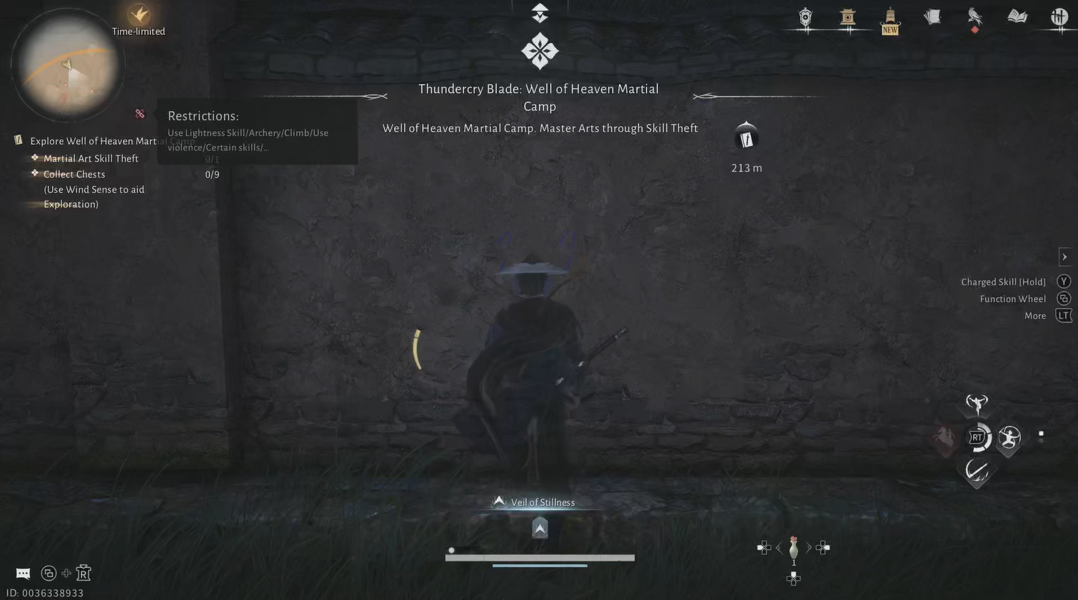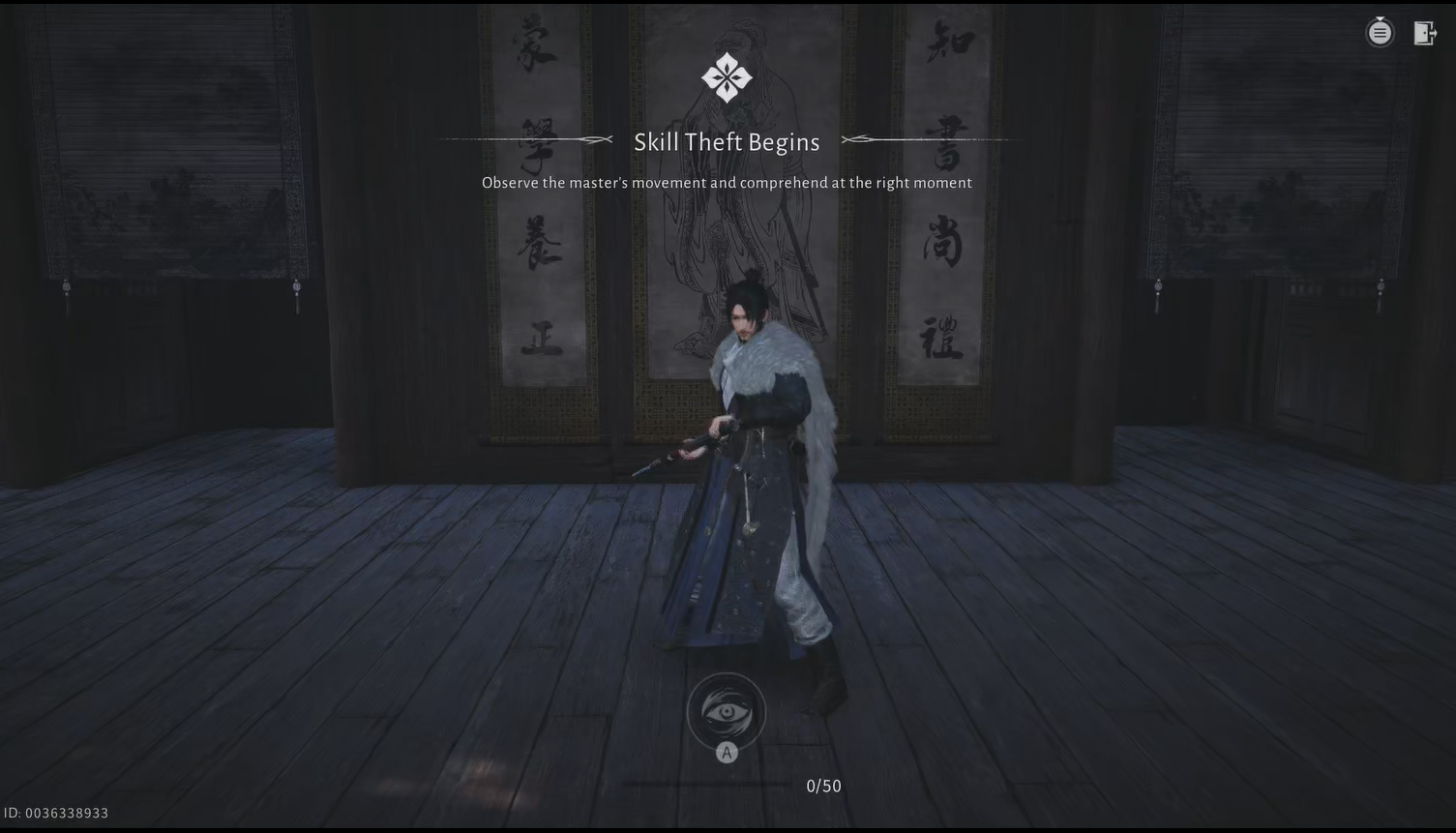 Climb the ladder leading to the upper platform where the Master is stationed. Once you reach the top, you’ll see a glowing blue ring that marks the Skill Theft zone. Step directly into this ring to trigger the Skill Theft interaction.