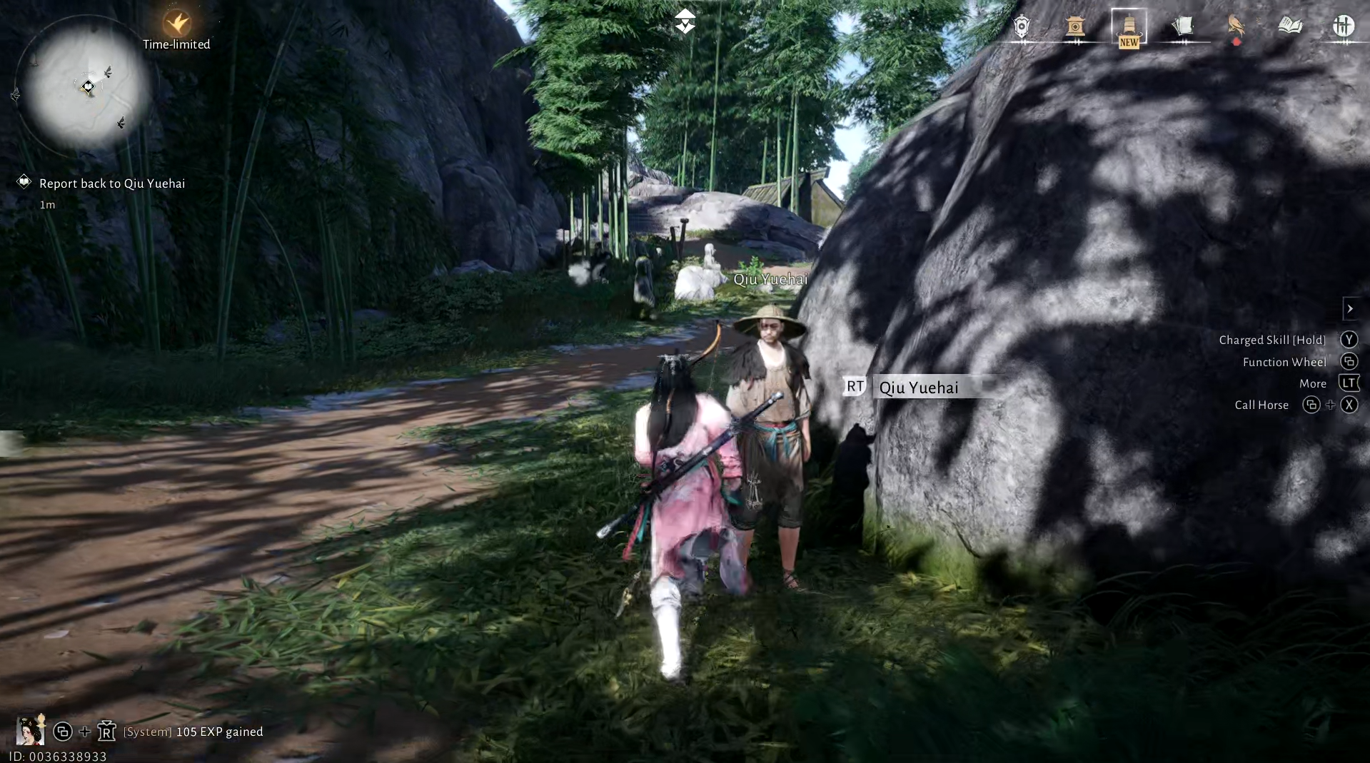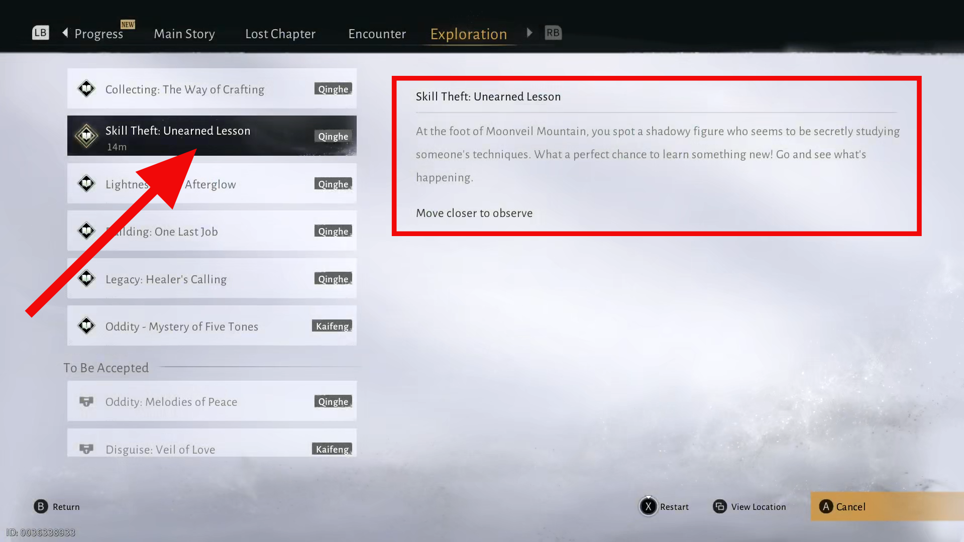 The Unearned Lesson exploration quest in Where Winds Meet begins by speaking with Qiu Yuehai at the marked location in Moonveil Mountain, Qinghe. In this quest, you use Wind Sense to locate a Skill Theft point, where you must complete a timing mini-game by pressing the prompted button whenever the golden circle appears. Successfully completing the Skill Theft unlocks the Veil of Stillness skill, and you finish the quest by reporting back to Qiu Yuehai.