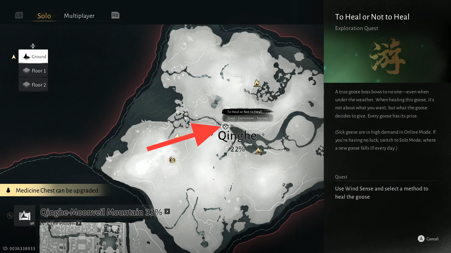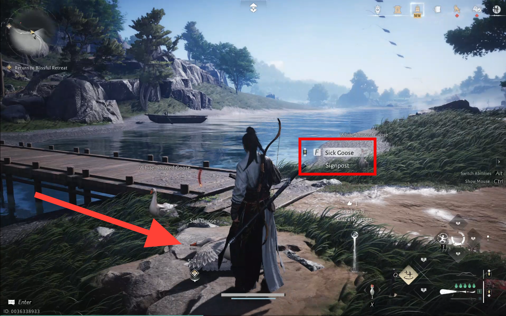"To Heal or Not to Heal exploration quest triggers at the riverbank in Qinghe, where you see a visibly sick goose lying by the water and get prompted to investigate.