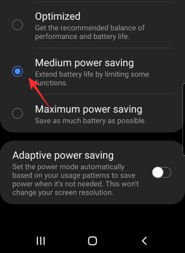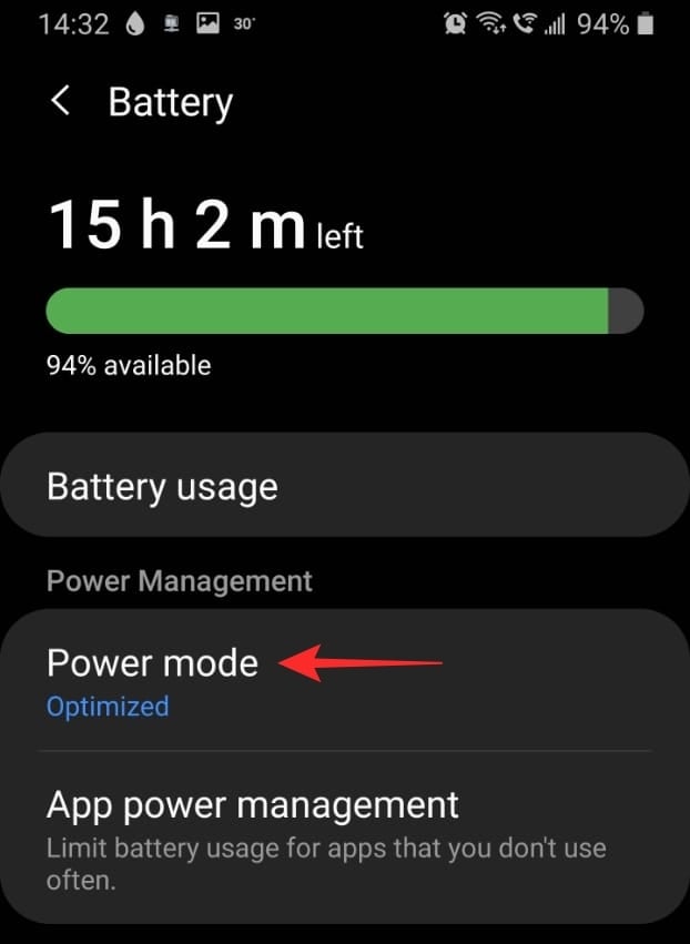 To turn on Power Saving mode on Samsung devices, open your device settings, and go to Device care > Battery > Power mode. Tap ‘Medium power saving’. Note: Different devices may have the setting under a different name. Search for ‘Optimized mode’, ‘Battery saver’ to find the setting.
