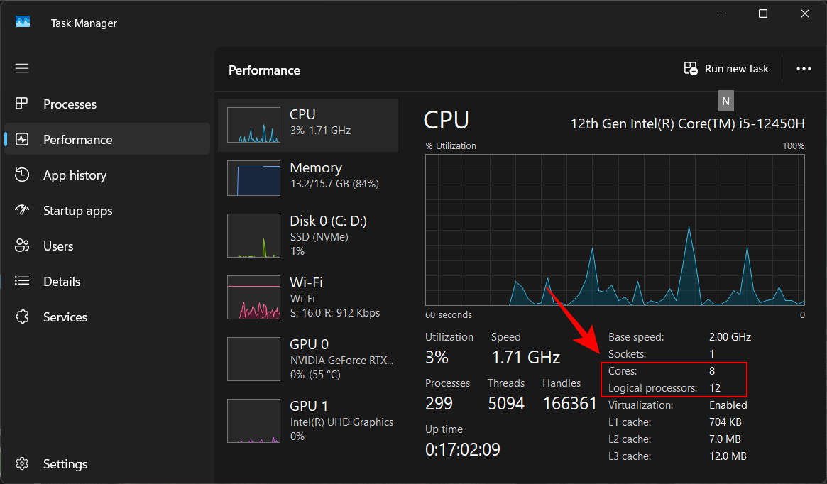 Note: You can find your core and thread count using Task Manager (Ctrl+Shift+Esc is the shortcut). Go to the Performance tab and it should say Cores for cores (X) and Logical processors for threads (Y)