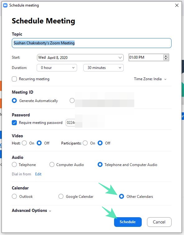 Go to your Zoom desktop app and click on schedule a meeting. When scheduling, make sure your calendar is set to Other Calendars. After scheduling, copy the invite link and distribute it to the participants.