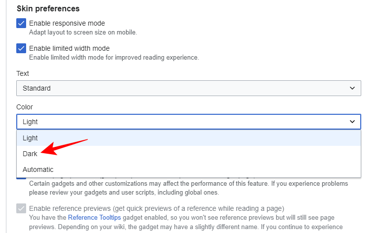 - Under ‘Color’, select Dark. You can also choose ‘Automatic’ and have Wikipedia automatically switch between light and dark based on your system settings.