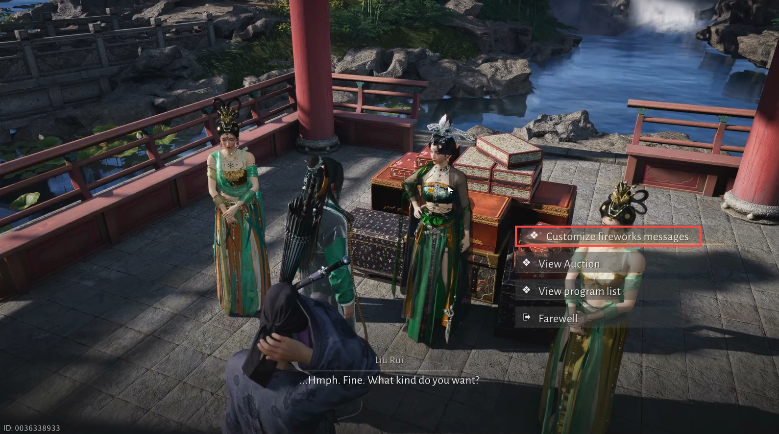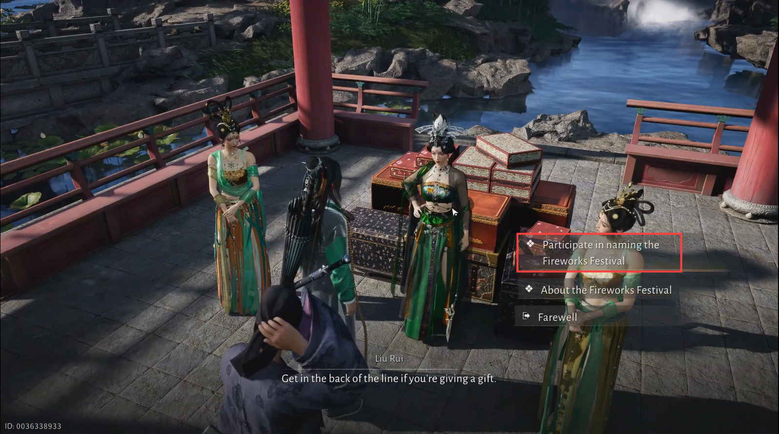 Find Liu Rui, who is standing near the registration point. Speak to her and select the option to participate in naming the fireworks festival.