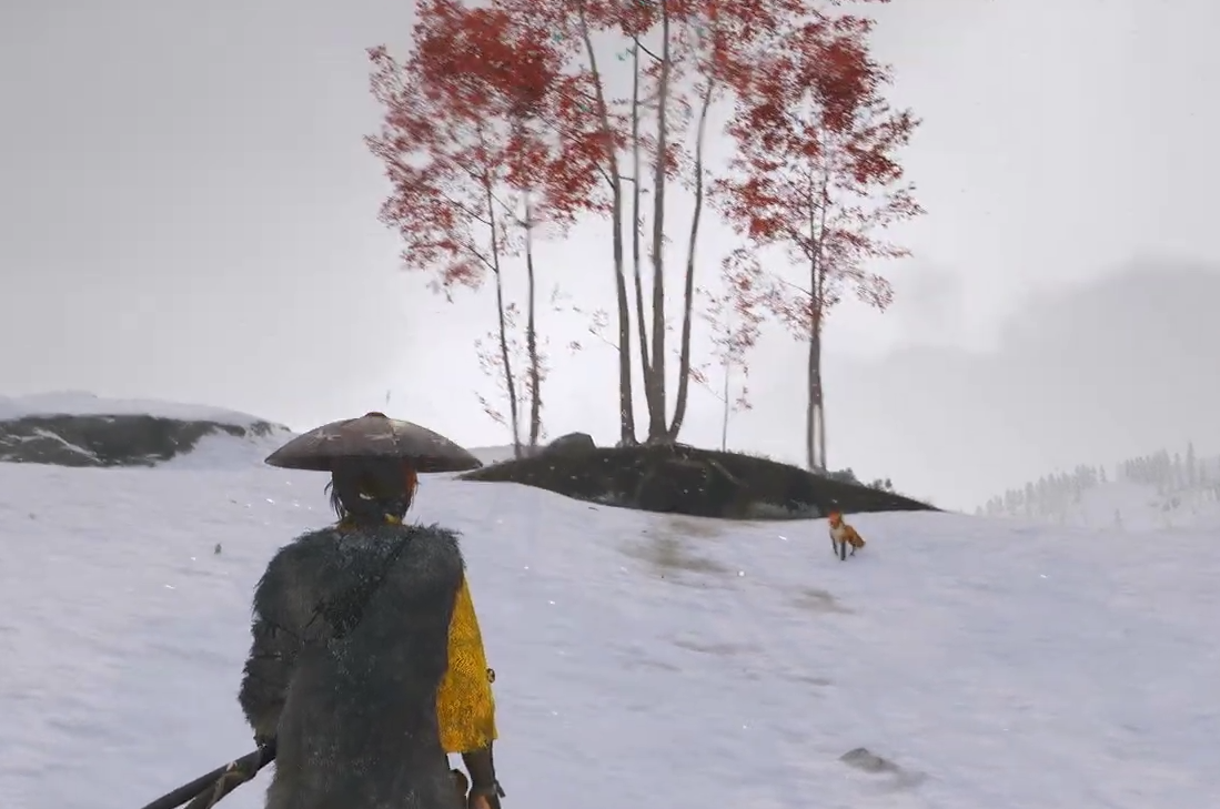 Travel along the riverside path north of Teshio Ridge, then approach the cluster of red-leafed trees marking the fox den. Interact with or approach the fox to begin the event.