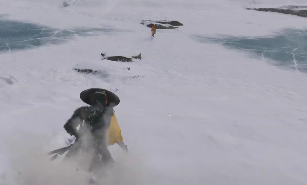The fox darts eastward, leaping up a dirt ridge just above the riverbank. The fox crosses a narrow tributary, jumping between stepping stones. Maintain close proximity or you’ll reset progress.