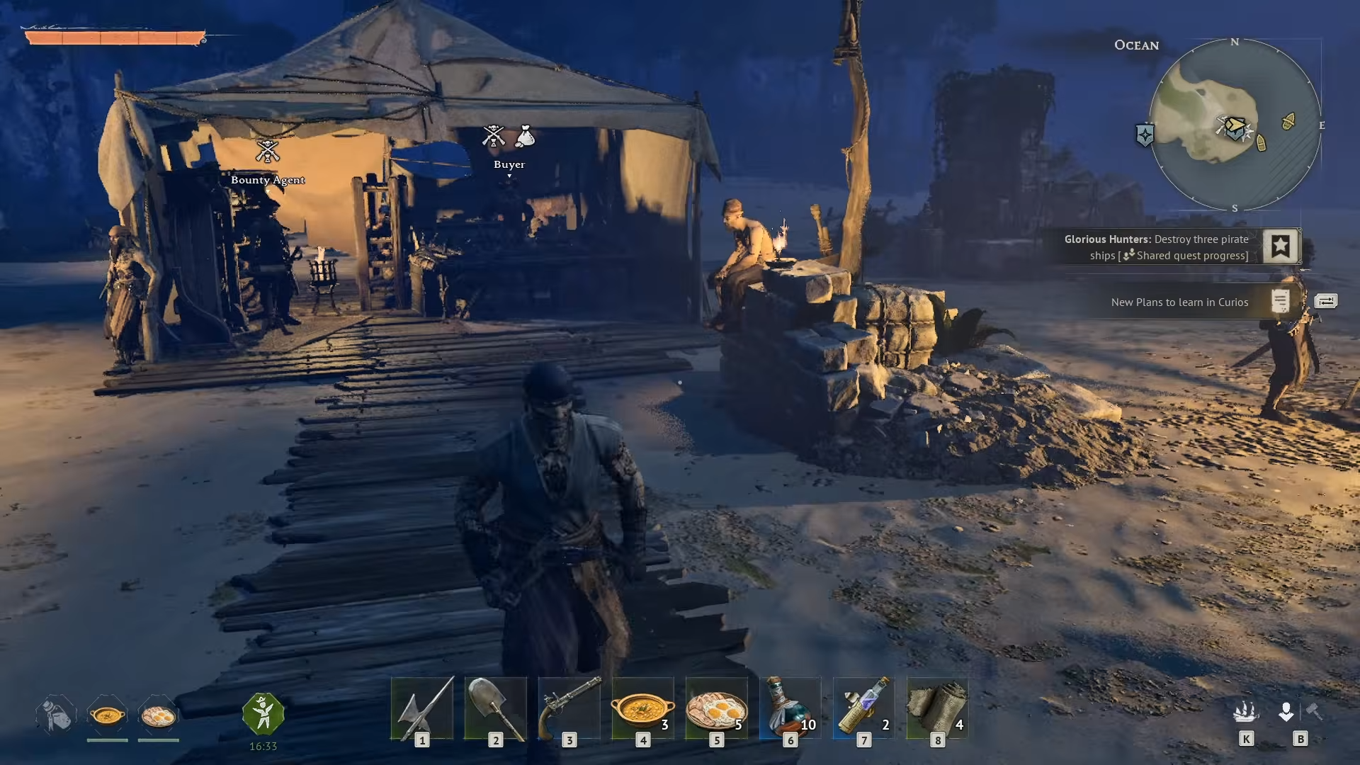 Sail southwest from your home base following the main quest marker. Upgrade your rowboat to handle level 6-10 pirate ships patrolling the waters. Dock and enter the market square.