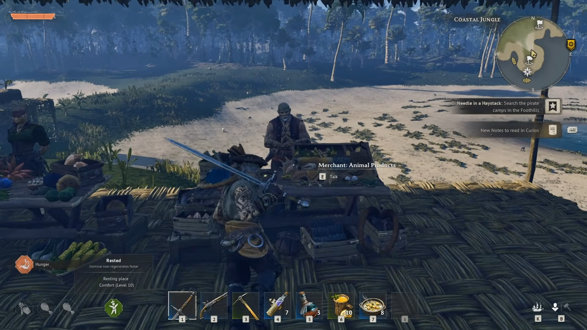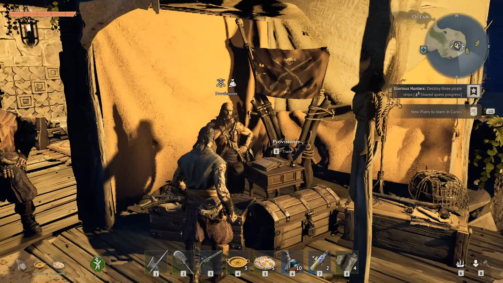 The market square hosts Provisioners from factions like People of Tortuga and Rogue Buccaneers, often with a fast travel campfire nearby. Pirate patrols en route make ship repairs essential before heading there.