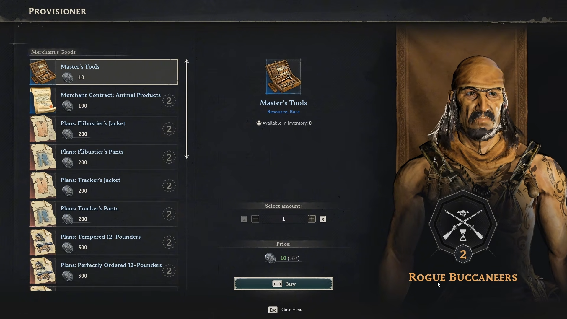 Interact with Provisioners. If below level 2 with People of Tortuga or Rogue Buccaneers, farm Insignias from pirate camps or quests first.