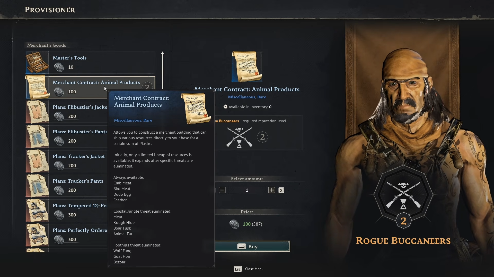 Select the contract (e.g., Animal Products from Rogue Buccaneers). Confirm the 100 Piastre cost and buy.