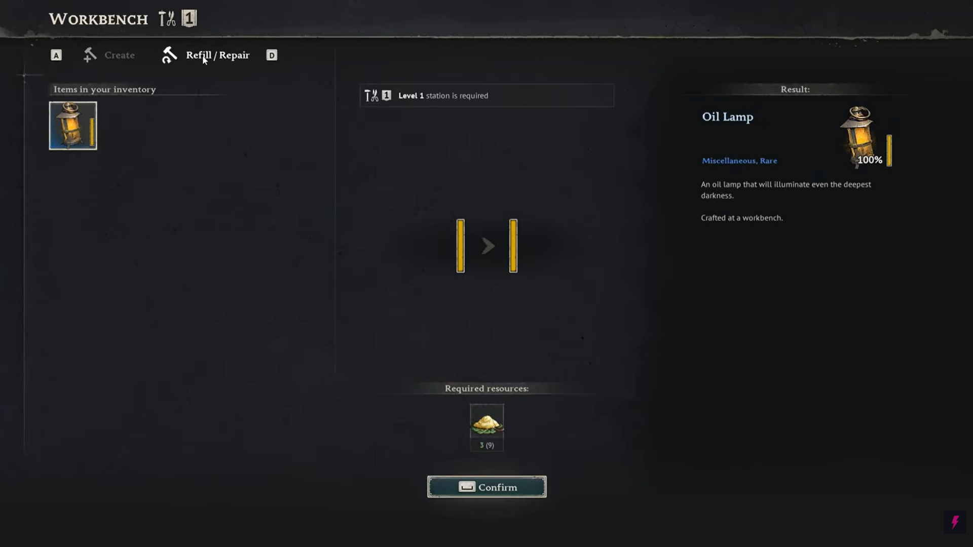 The oil lamp in Windrose may also degrade over time depending on usage and game mechanics. The same “Refill and Repair” section at the workbench handles both fuel restoration and condition repairs.