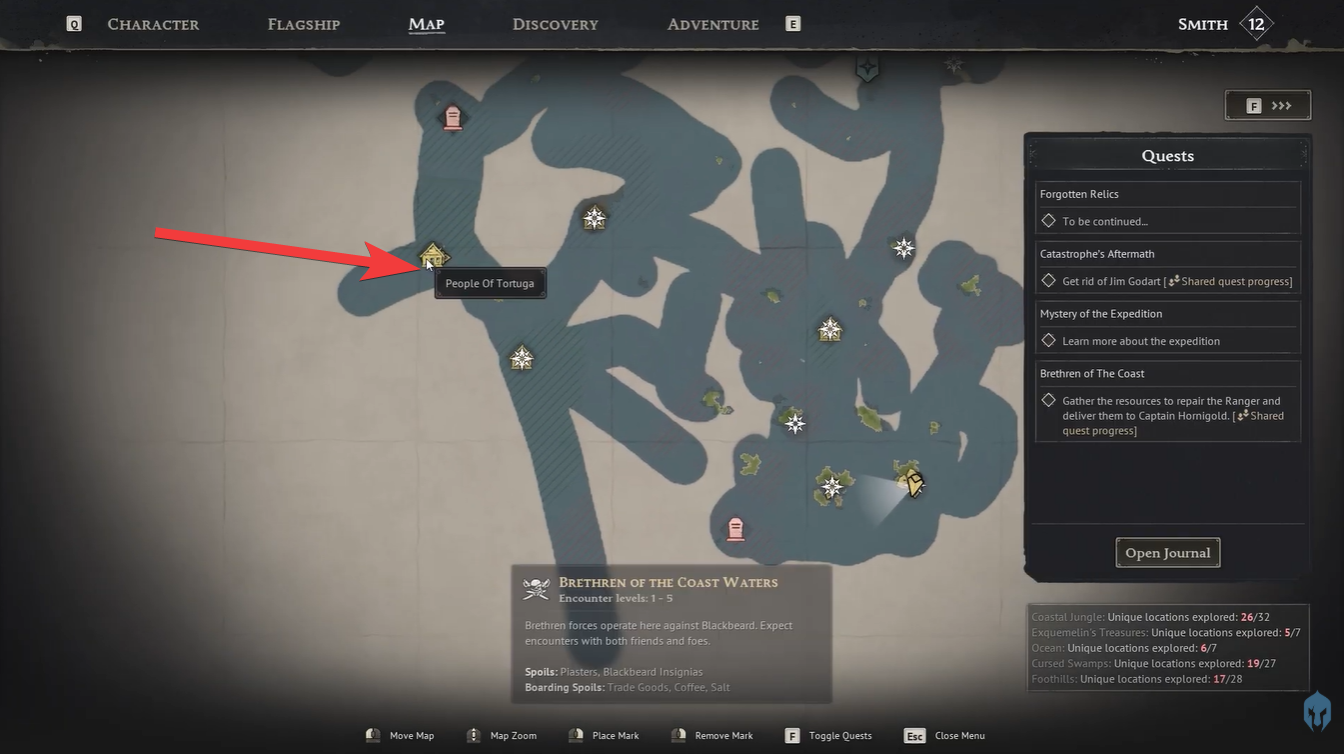 The four factions you’ll deal with are the Buccaneers, the People of Tortuga, the Brethren of the Coast, and the Smugglers. Each faction has its own identity, territory, and trade preferences, which directly affects how you sell items.