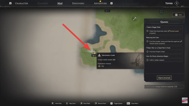 Explore your island and locate a copper deposit marked by a question mark on the map.