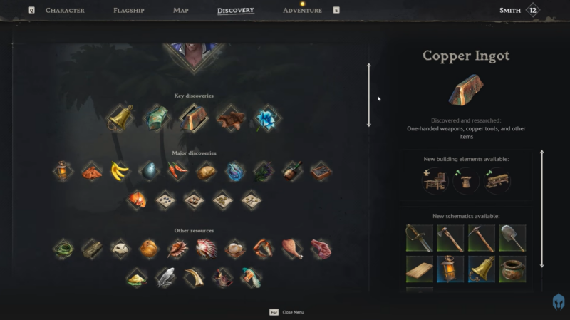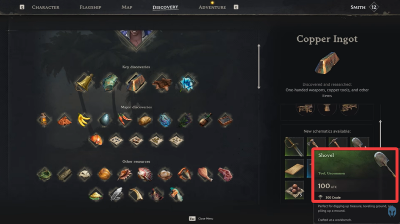Windrose uses a discovery-based crafting system rather than giving you recipes upfront. This means you won’t immediately see the shovel in your crafting menu when you start the game. Instead, you must naturally progress through resource gathering and processing to unlock it.