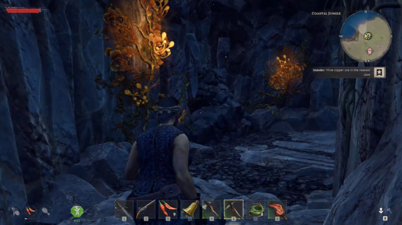 Once inside a cave, you will need to locate copper nodes and mine them. These are usually embedded in rock walls and are distinguishable by their metallic appearance.