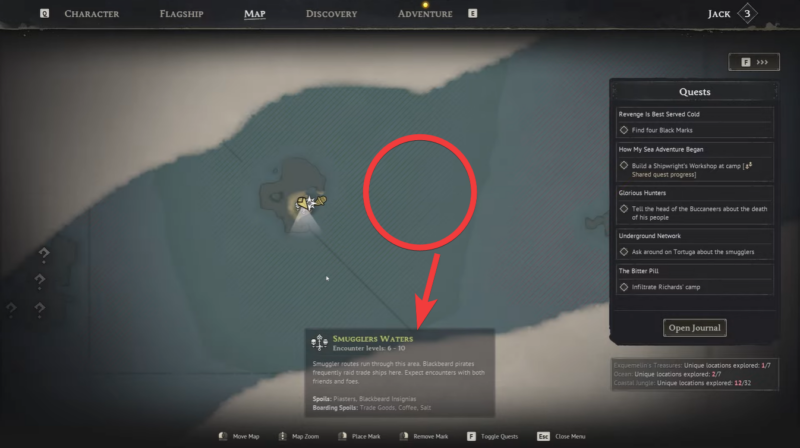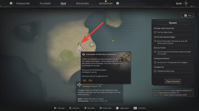 The smuggler base is hidden inside a cave. This is an important detail many players overlook. You won’t find NPCs or buildings outside; instead, you must dock and explore the island until you locate the cave entrance.