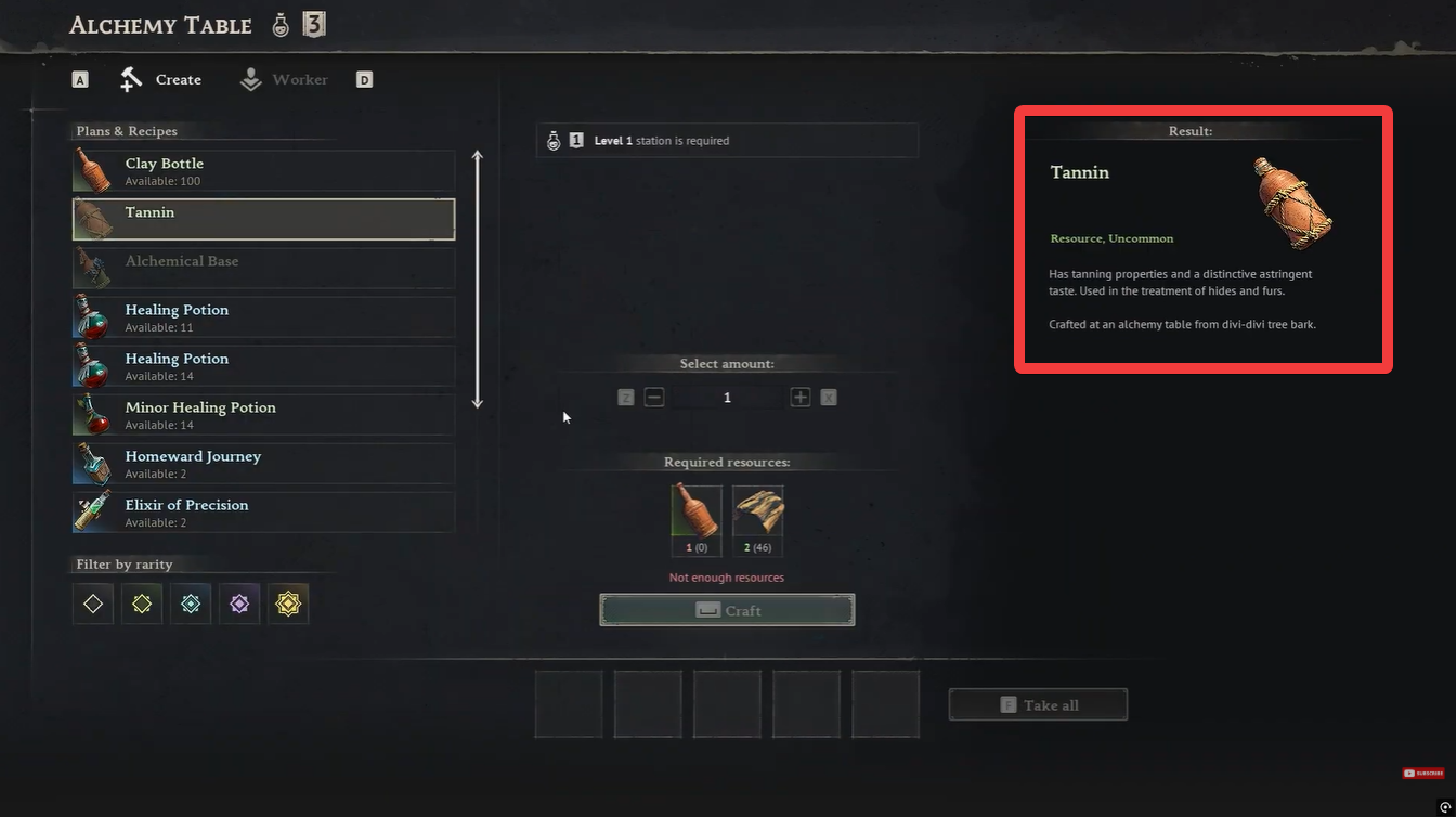 Interact with the Alchemy Table and navigate to the Tannin recipe in the crafting menu. Ensure your station meets the required level.
