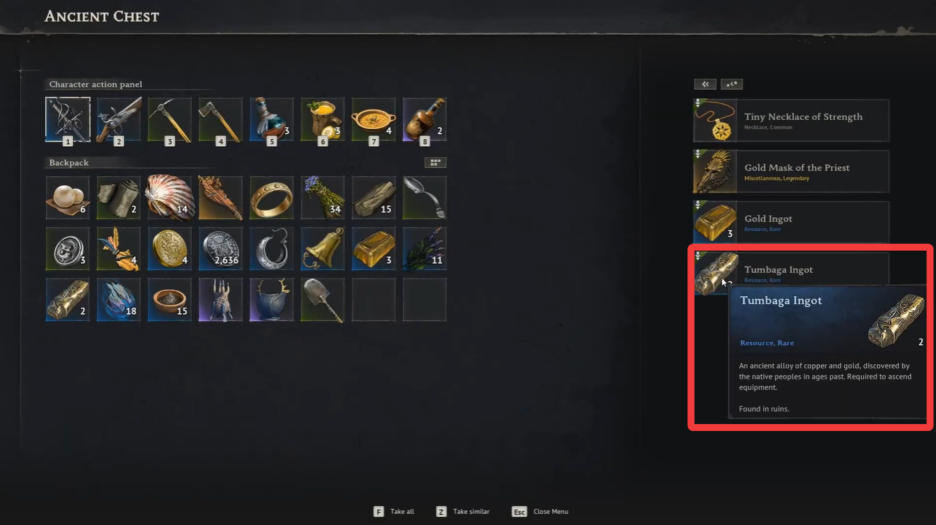 The Ancient Chest does not only reward you with Tumbaga Ingots but also provides a mix of rare and valuable items, making it worth seeking out early in your progression.