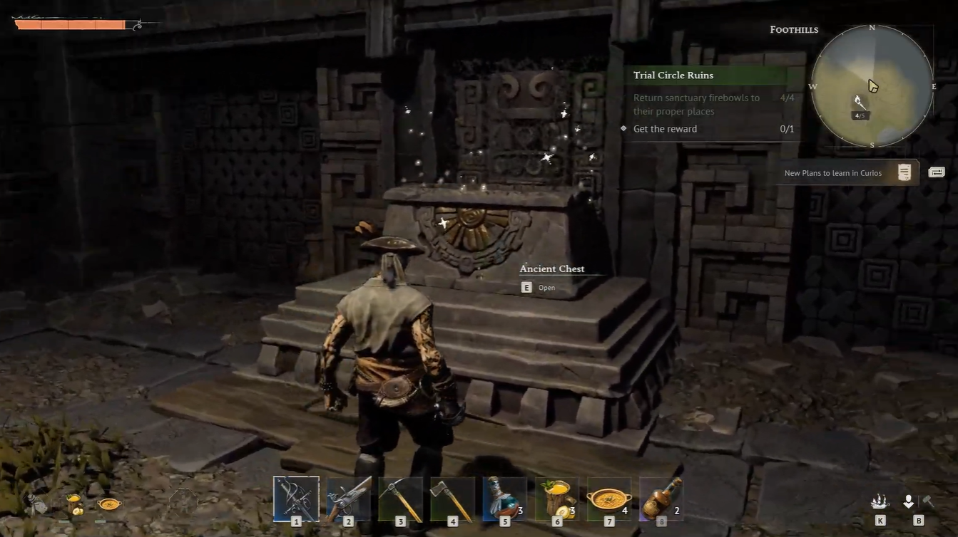 The Ancient Chest is hidden within ruin structures scattered across the Foothills region, specifically in areas tied to ancient rituals and abandoned sanctuaries. You should focus your search on the Trial Circle Ruins, which are circular stone formations often surrounded by broken pillars and weathered carvings. These ruins are easy to recognize due to their symmetrical layout and elevated terrain.