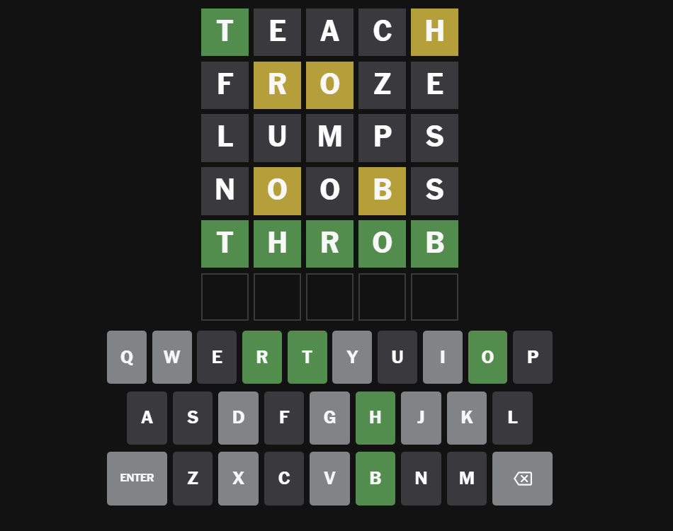 So yes, today’s Wordle answer is THROB — a word that pulses with life, energy, and urgency. Simple? Yes. But today, it got to the very heart of Wordle.
