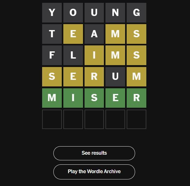Today’s answer, miser, carried a deceptively simple structure that masked its specific meaning. Many players likely circled around related personality words before landing on the right one. Its everyday familiarity made it feel close yet elusive. How many guesses did you need for this one?