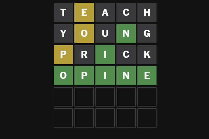 Today's answer, OPINE, offered a gentle challenge by pushing players to think about verbs tied to ideas and expression. Its clean structure made it fair, but guessing it still required insight. How many guesses did you need to unlock it?
